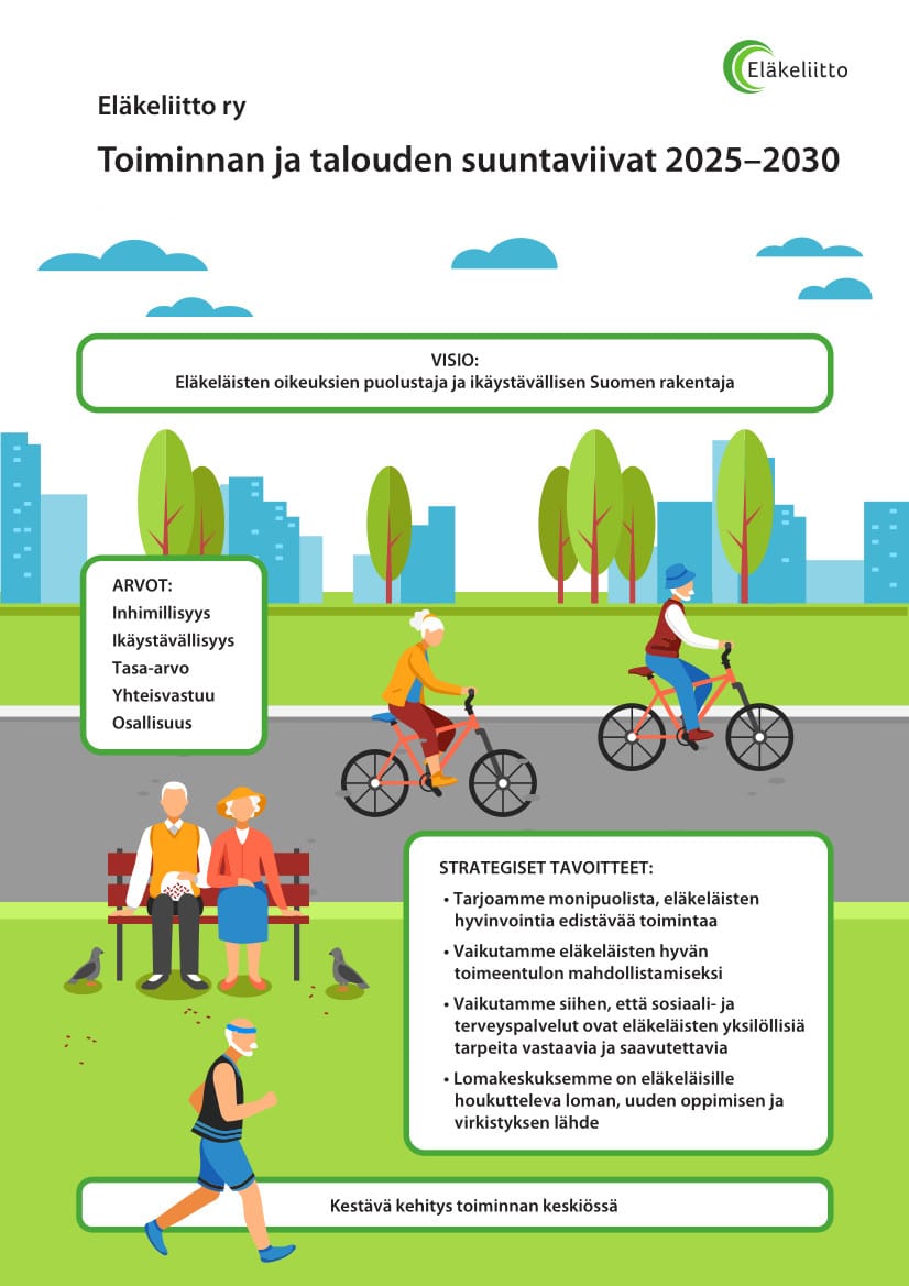 Eläkeliitto puolustaa eläkeläisten oikeuksia ja tuo ikäihmisten äänen kuuluviin päätöksenteossa ja mediassa. Olemme asiantunteva ja luotettava vaikuttaja, joka rakentaa ikäystävällistä Suomea.