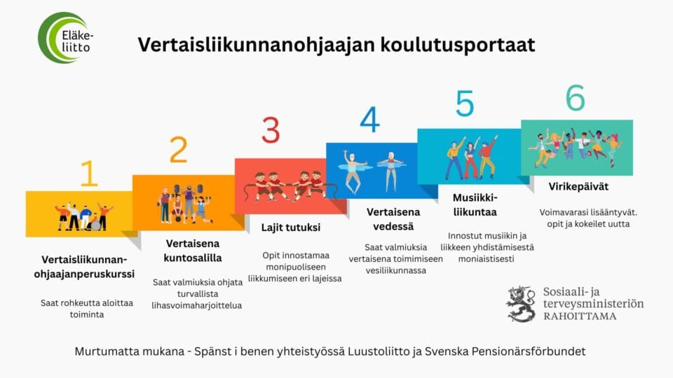 Eläkeliiton liikuntakoulutuksiin voi tulla kuka tahansa, jota kiinnostaa liikkuminen ja yhdessä tekeminen. Vertaisohjaajaksi ryhtyminen on helppoa, sillä et tarvitse aiempaa kokemusta ohjaamisesta, sillä koulutuksissa saat käytännön vinkkejä, rohkaisua ja vertaisten tukea. Näin alkuun lähtemisen kynnys madaltuu ja saat varmuutta ottaa ensiaskeleet ohjaajana.