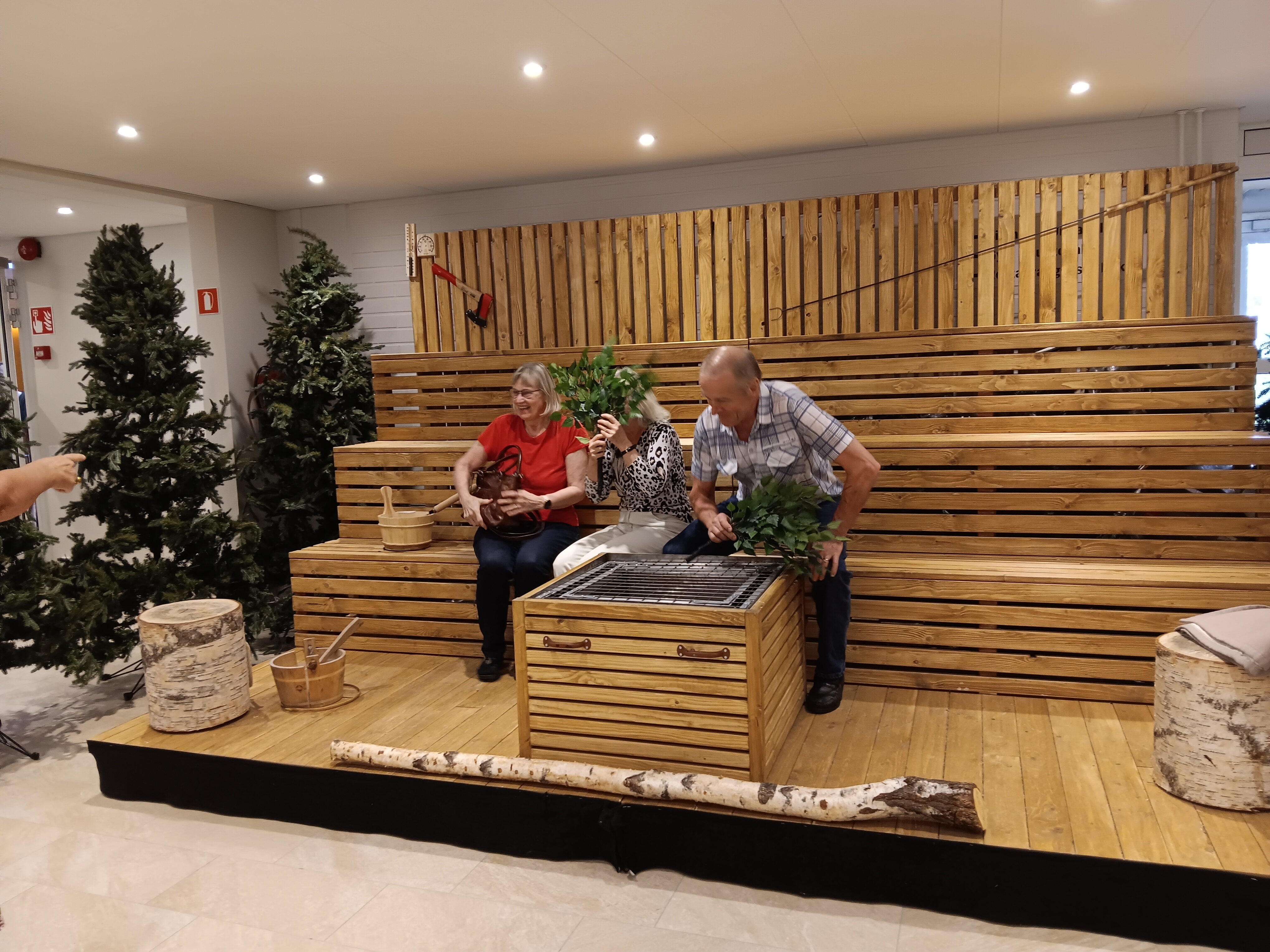 Sitten alkoikin jo ruoka olemaan mielessä, joten ajettiin Vöyrille. Norrvalla on nykyään suosittu kurssi- ja leirikeskus. Sen tilavassa ruokalassa oli hyvin tilaa koko ison ryhmän ruokailuun. Norrvallan aulassa on Kaj-yhtyeen saunarakennelma, joka oli heillä mukanaan kevään Euroviisuissa Sveitsissä. Moni siinä kuvauttikin muistoksi itsensä.