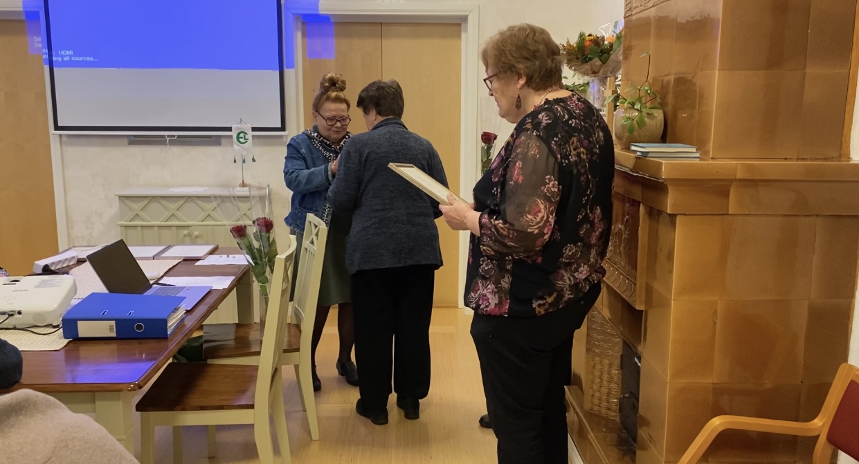 Syyskokouksen yhteydessä juhlittiin kakkukahvien kera kunniamerkkien ja -kirjojen saajia.