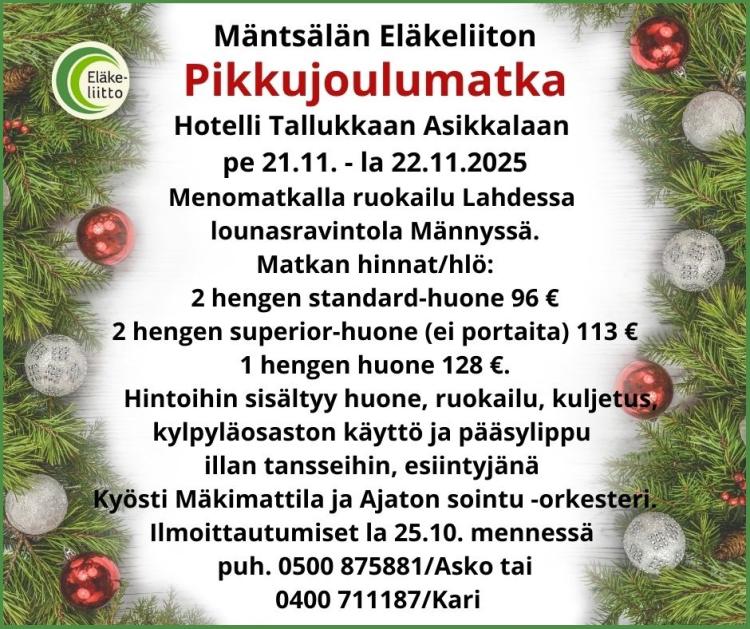 Yhdistys järjestää hotellimatkan Ahvenanmaalle. Lähtö ma 19.8. klo 7.15 Mäntsälän linja-autoasemalta.