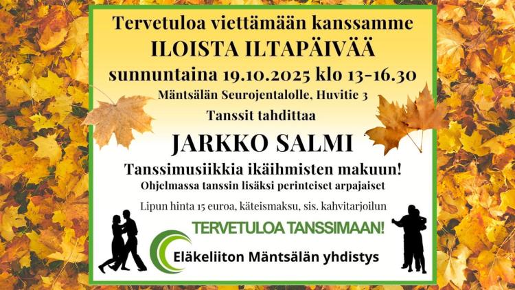 Tervetuloa viettämään Iloista iltapäivää sunnuntaina 20.4.2025 klo 13-16.30 Mäntsälän Seurojentalolle, Huvitie 3.