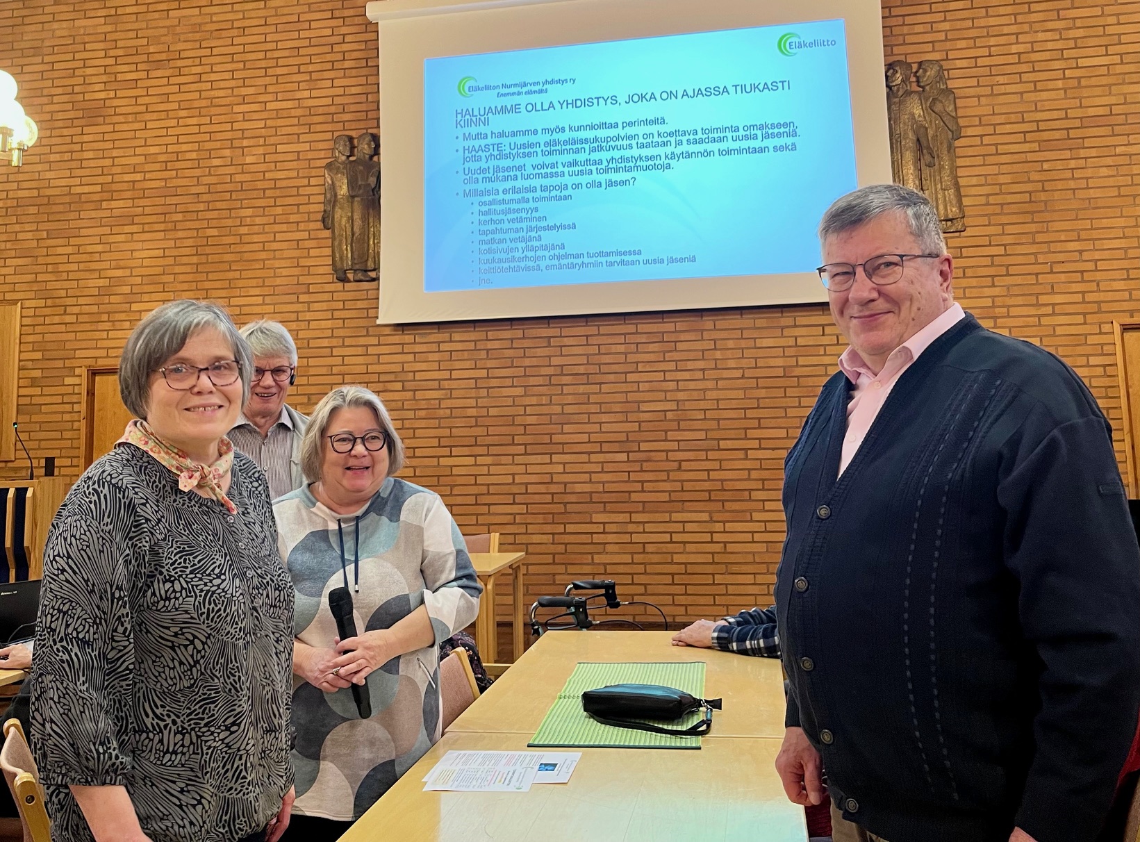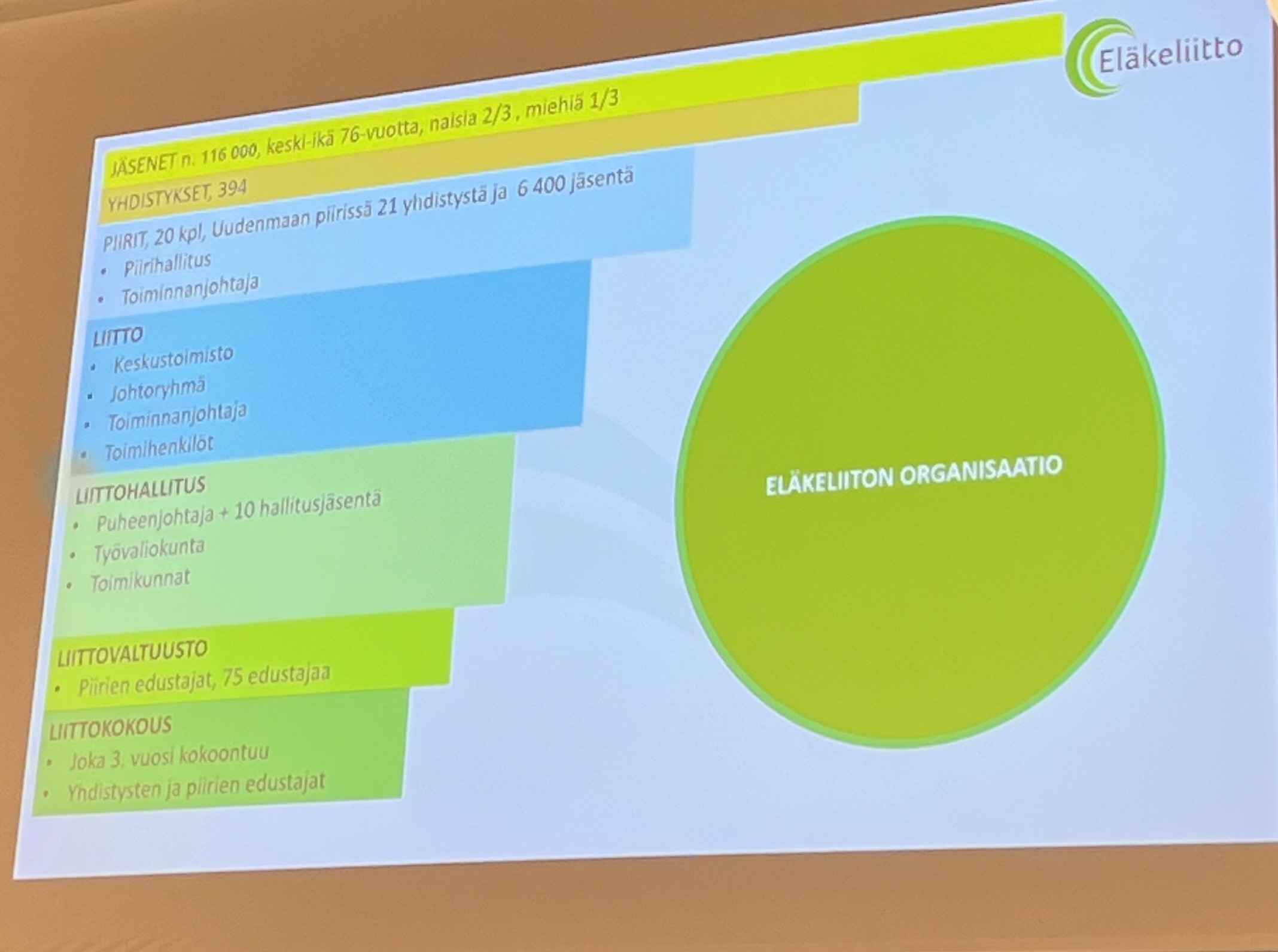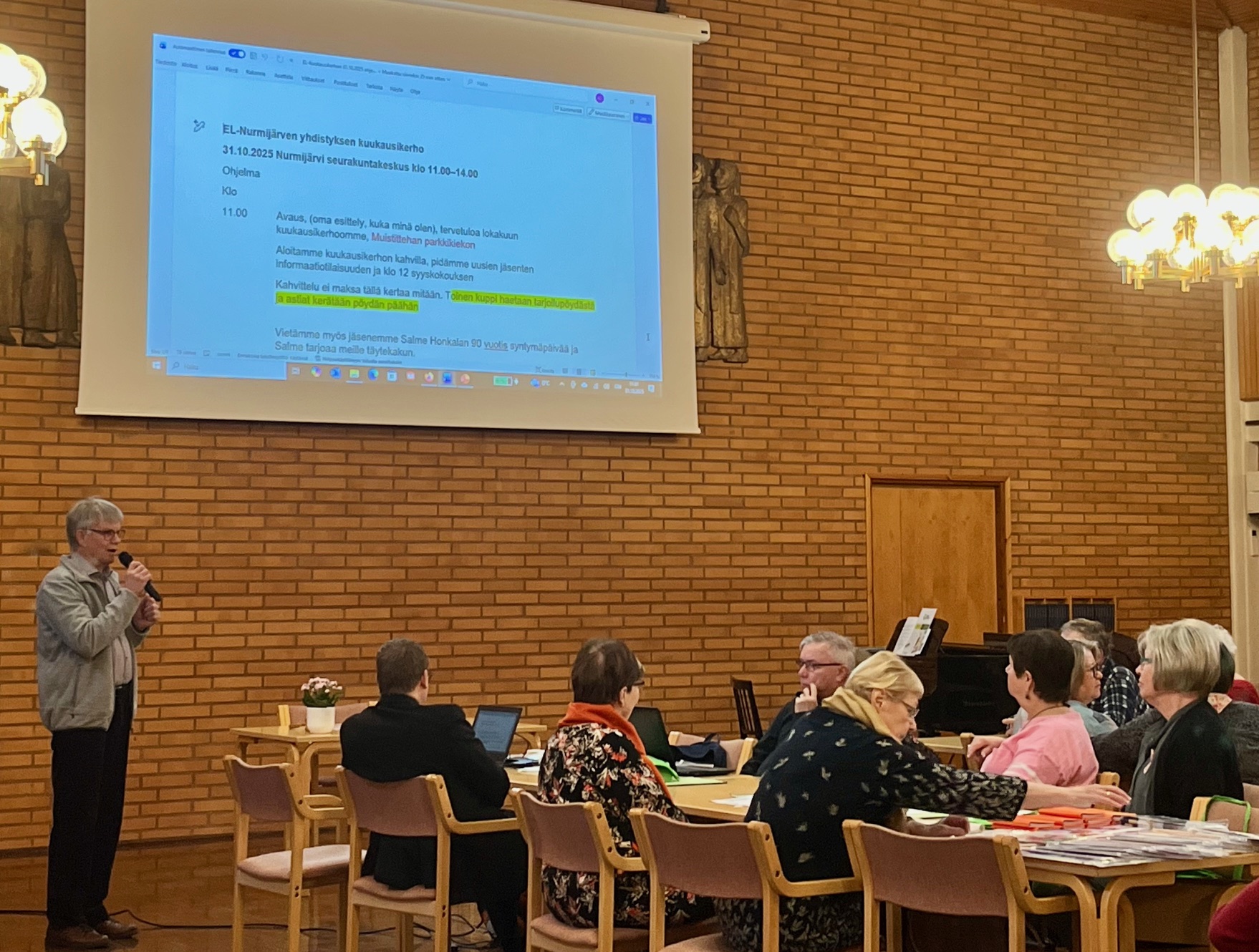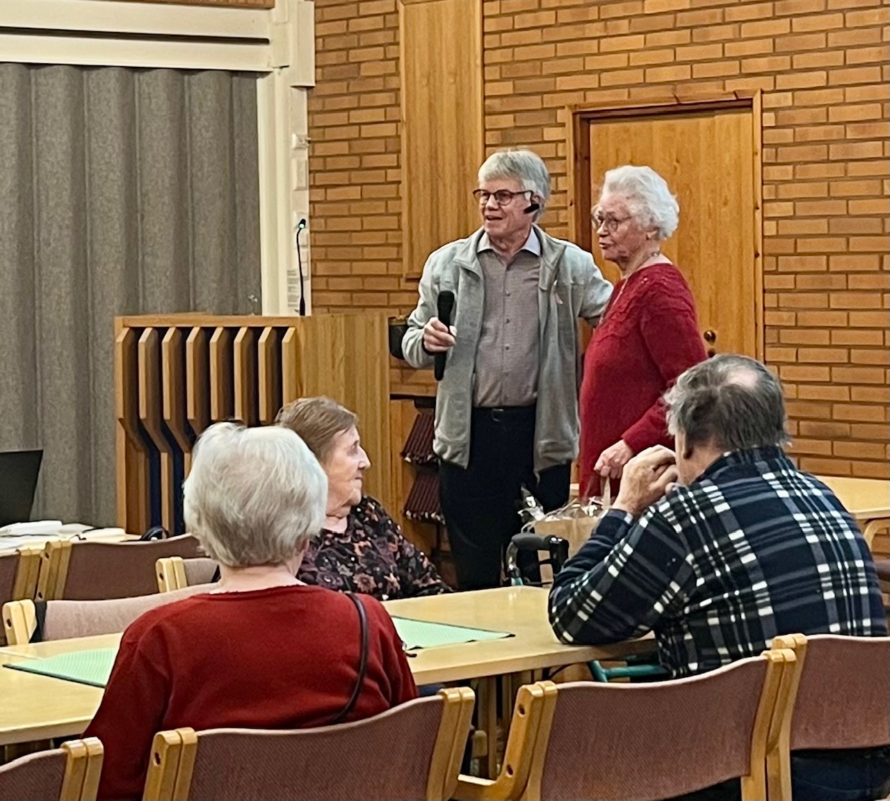 - Puheenjohtaja Antti Simanainen esitteli Eläkeliiton ja yhdistyksen toimintaa uusille jäsenille, ja ihan hyvä oli esittelyä vanhempienkin jäsenten kuulla.