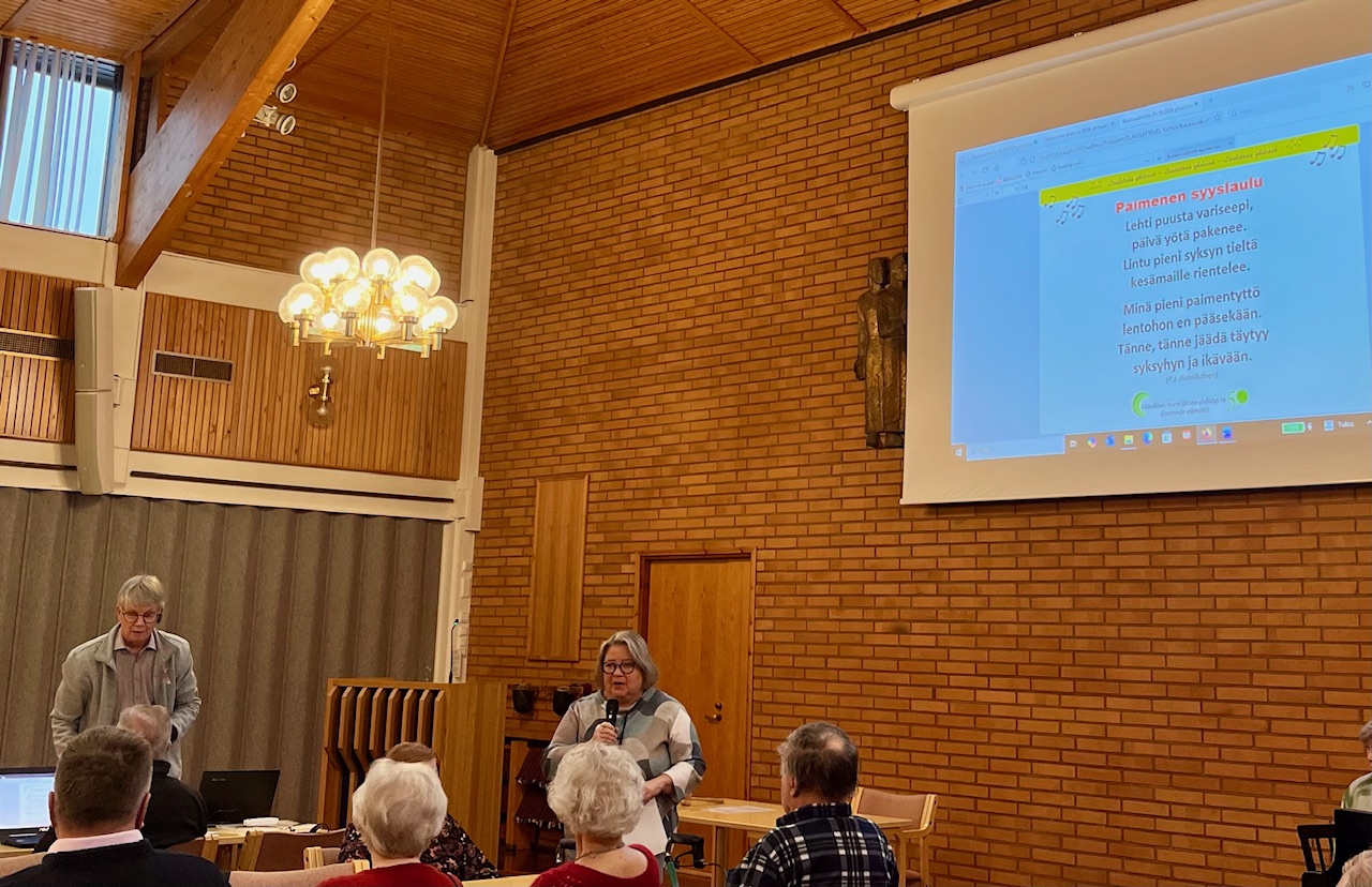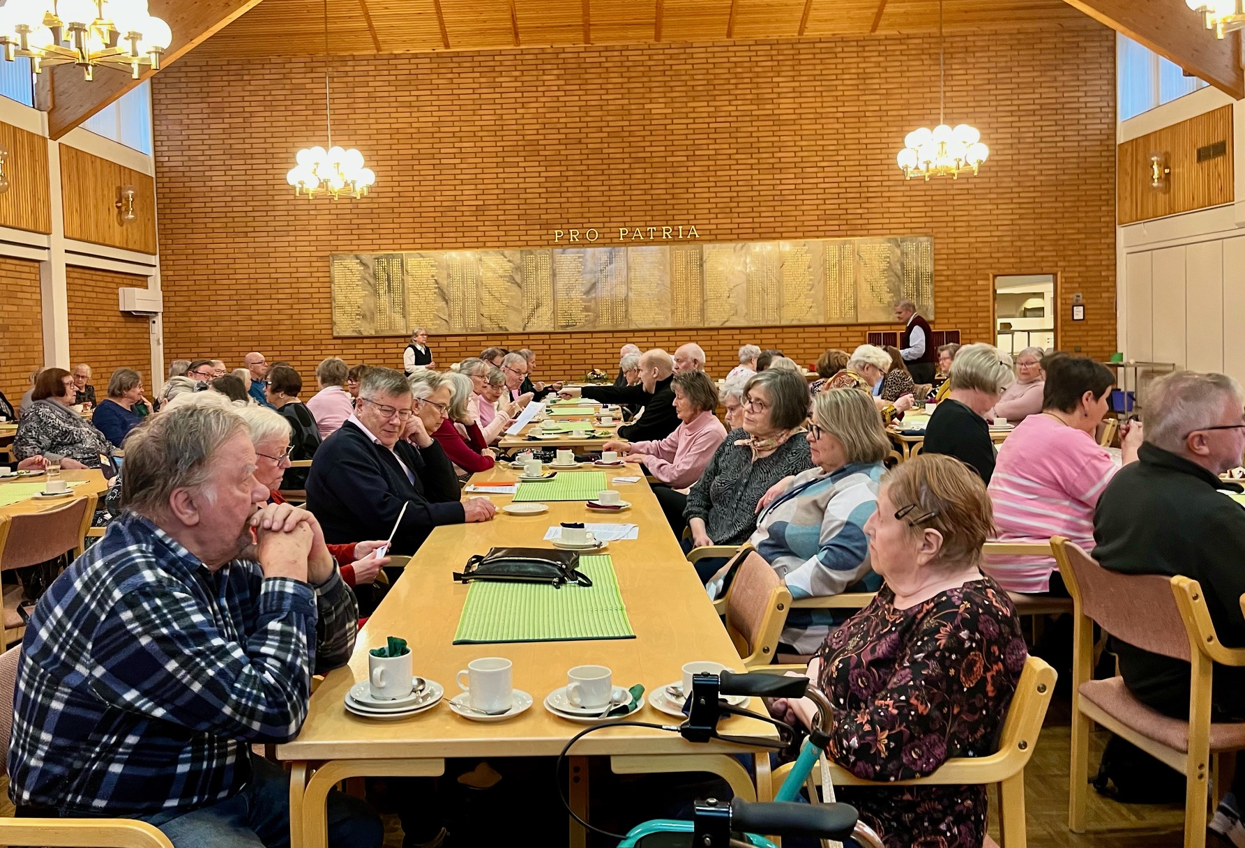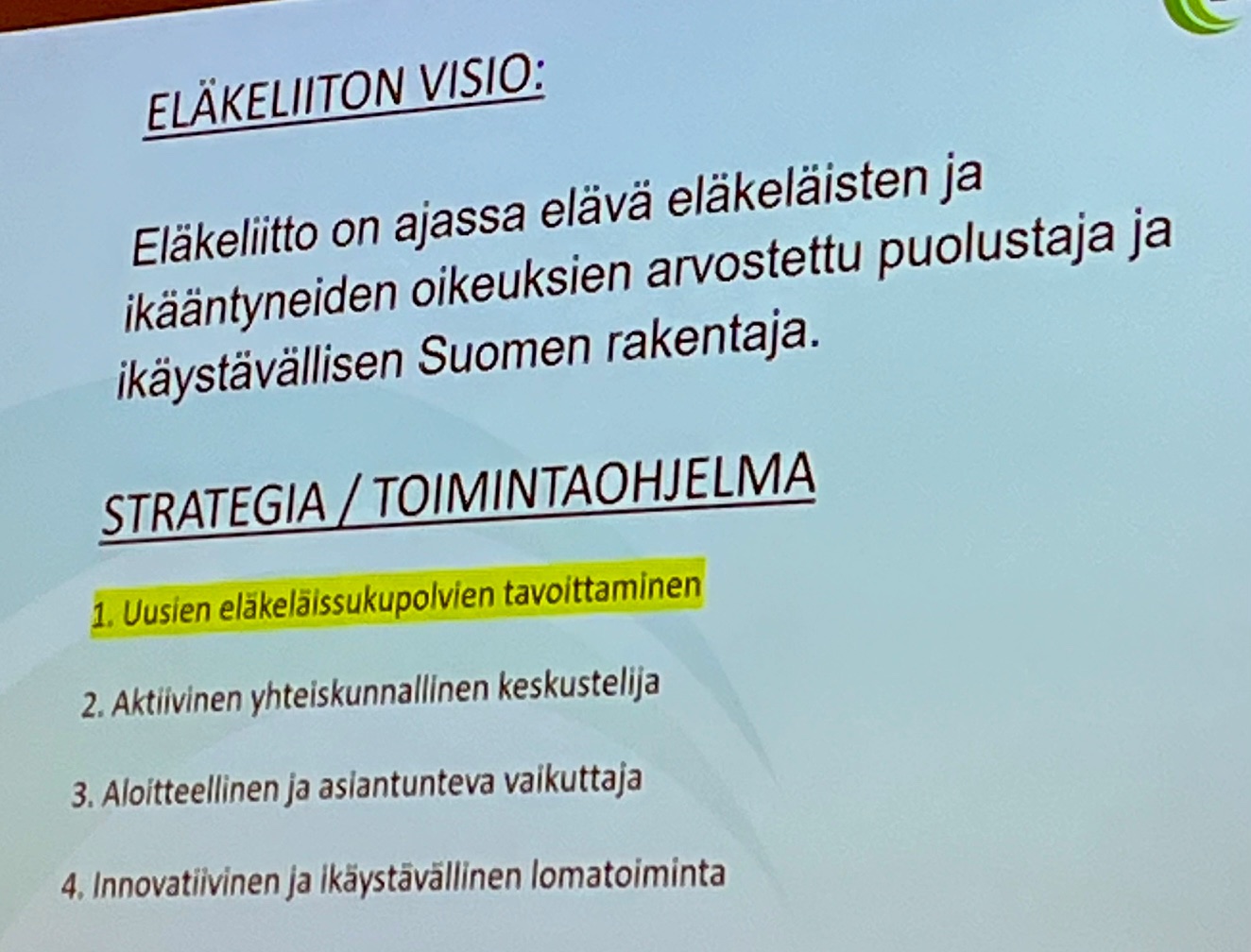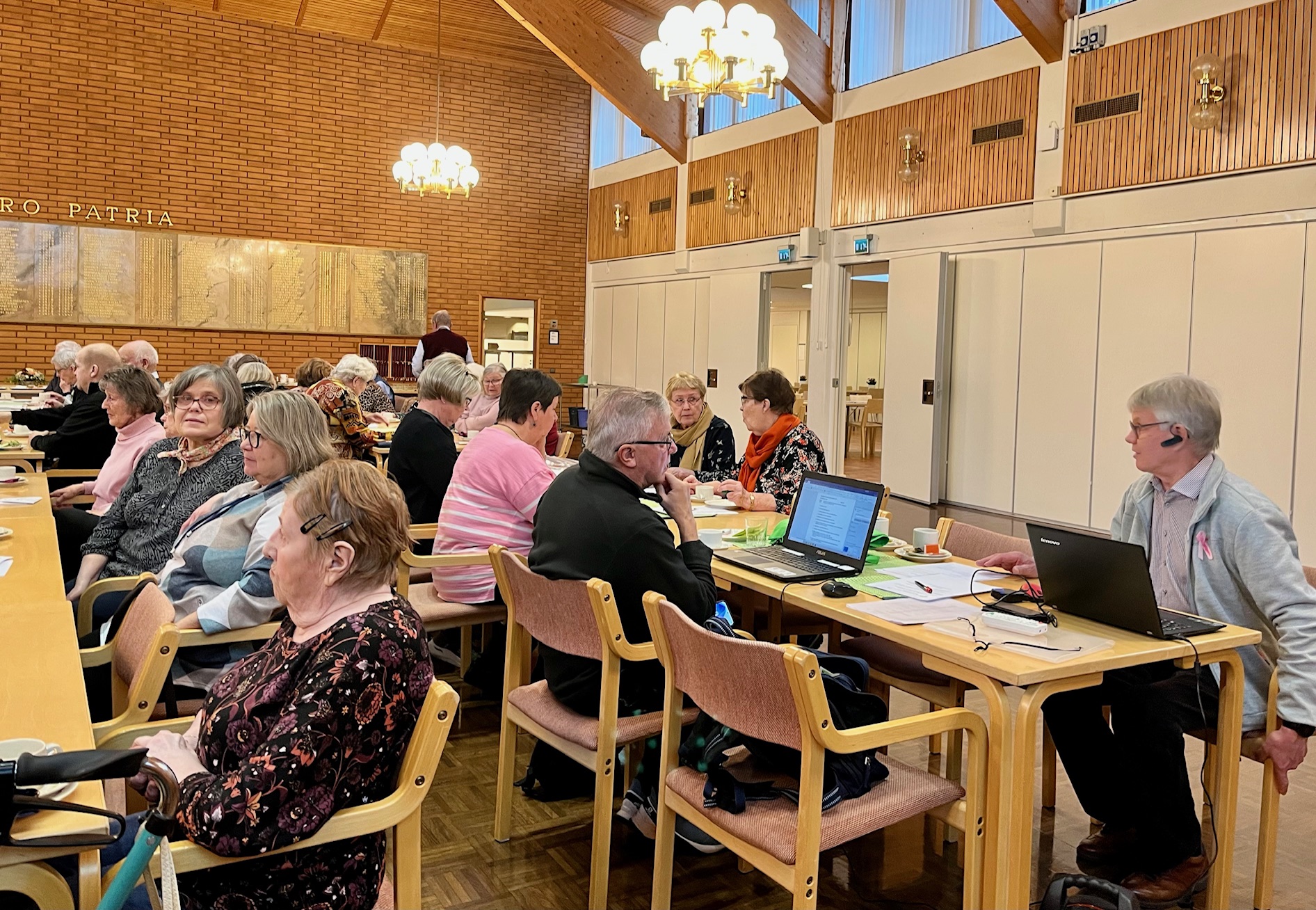 - Puheenjohtaja Antti Simanainen esitteli Eläkeliiton ja yhdistyksen toimintaa uusille jäsenille, ja ihan hyvä oli esittelyä vanhempienkin jäsenten kuulla.