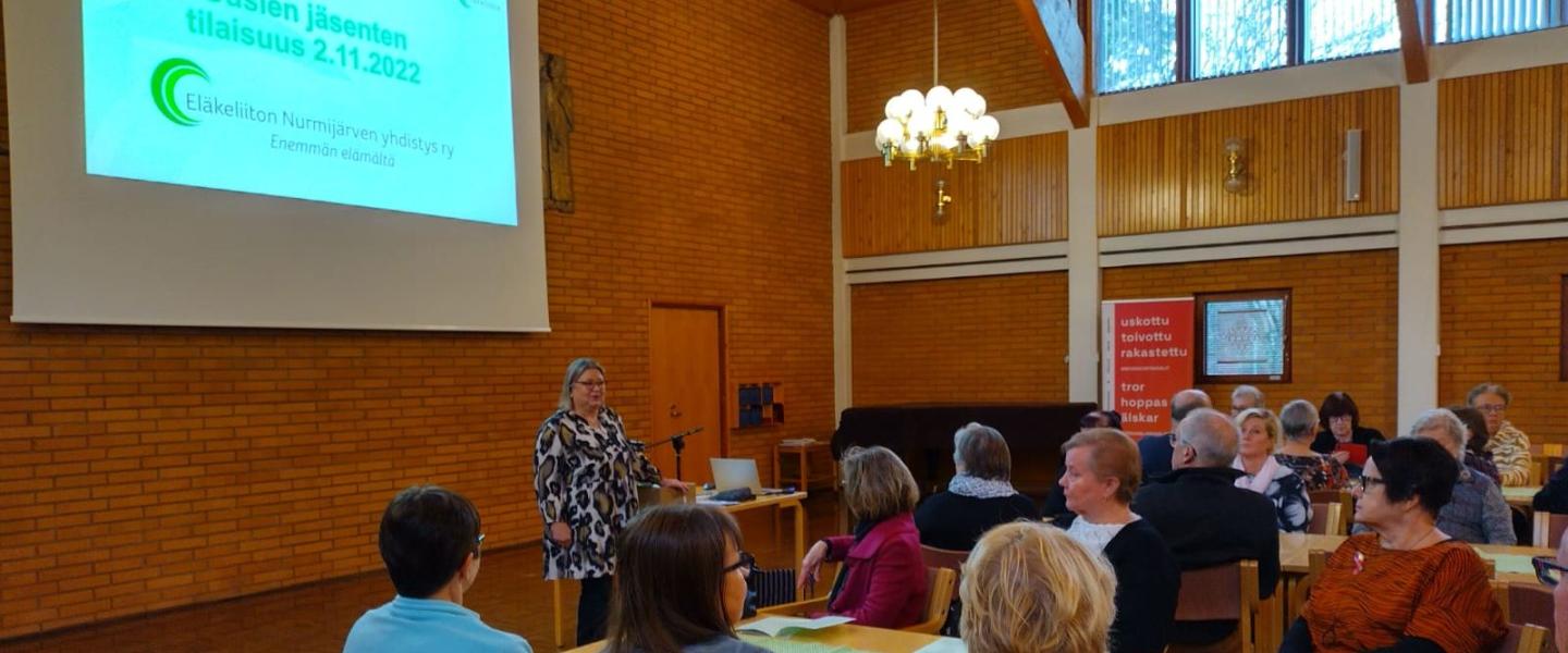 Yhdistyksen puheenjohtaja Margit Taponen piti diaesityksen Eläkeliiton toimintaperiaatteista, visioista ja strategioista, kertoi liiton omistamasta Salon liepeillä sijaitsevasta lomanvietto- ja kurssikeskuksesta Lehmirannasta.