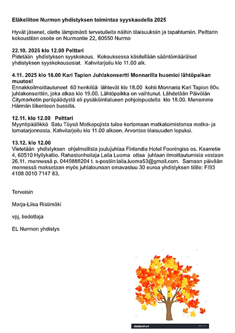 EL Nurmon yhdistyksen syksyn 2025 tapahtumia