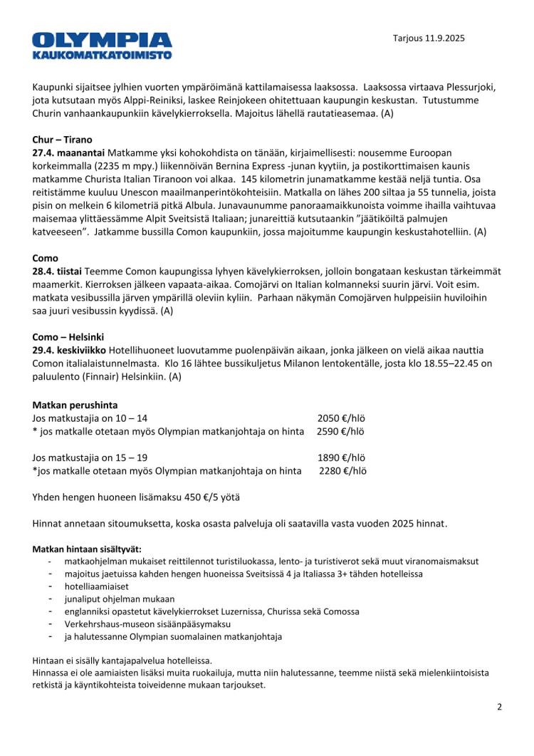 Matkan hinta perustuu 11.9.2025 voimassa olleisiin maajärjestelyhintoihin (Sveitsin osalta hinnat on saatu Sveitsin frangeissa) sekä vahvistettuun lentohintaan, jossa lentoverojen tai polttoainemaksun osuus saattaa muuttua.