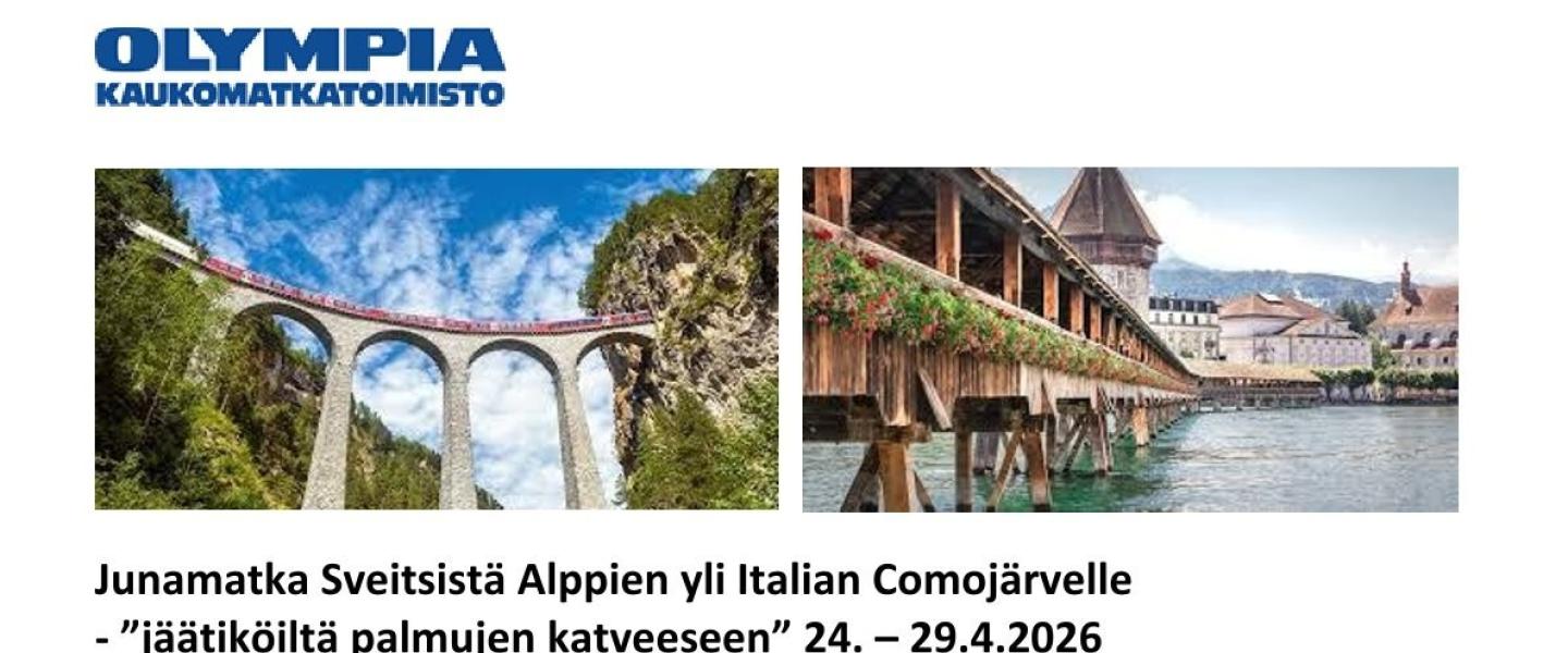 27.4. maanantai Matkamme yksi kohokohdista on tänään, kirjaimellisesti: nousemme Euroopan korkeimmalla (2235 m mpy.) liikennöivän Bernina Express -junan kyytiin, ja postikorttimaisen kaunis matkamme Churista Italian Tiranoon voi alkaa. 145 kilometrin junamatkamme kestää neljä tuntia. Osa reitistämme kuuluu Unescon maailmanperintökohteisiin. Matkalla on lähes 200 siltaa ja 55 tunnelia, joista pisin on melkein 6 kilometriä pitkä Albula. Junavaunumme panoraamaikkunoista voimme ihailla vaihtuvaa maisemaa ylittäessämme Alpit Sveitsistä Italiaan; junareittiä kutsutaankin ”jäätiköiltä palmujen katveeseen”. Jatkamme bussilla Comon kaupunkiin, jossa majoitumme kaupungin keskustahotelliin. (A)
