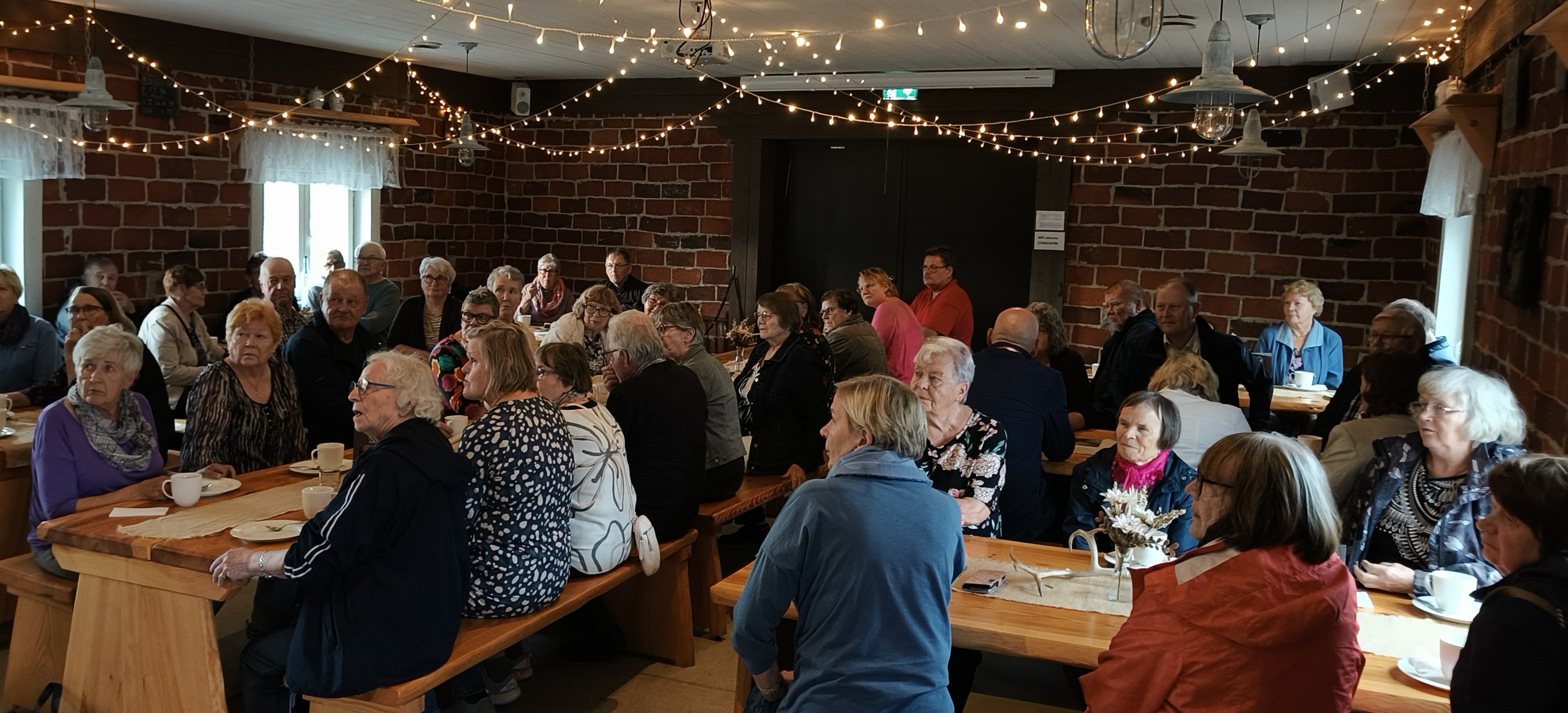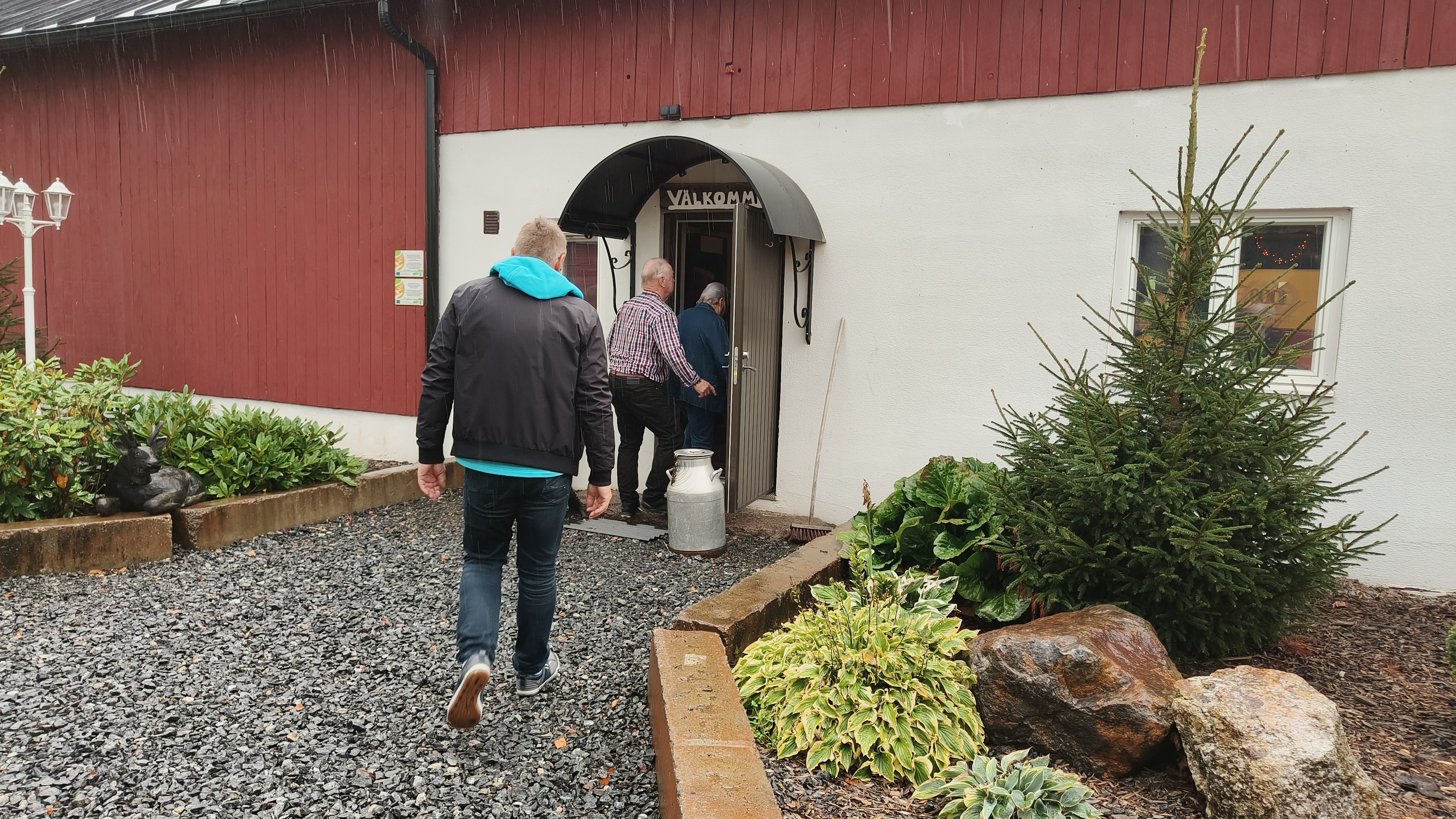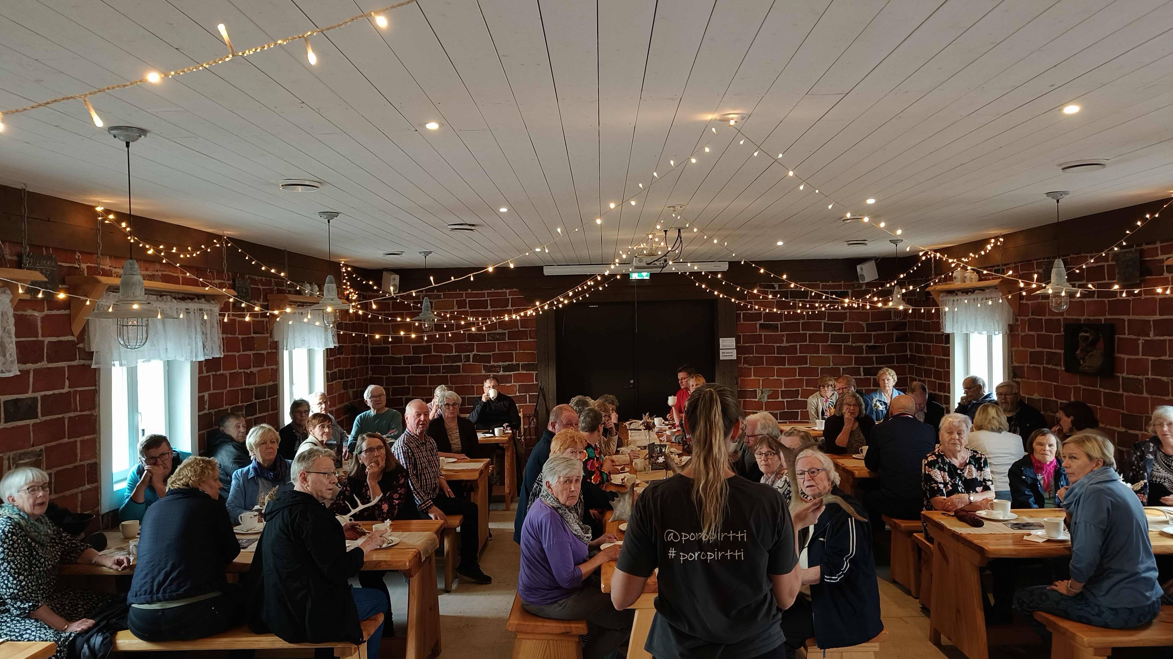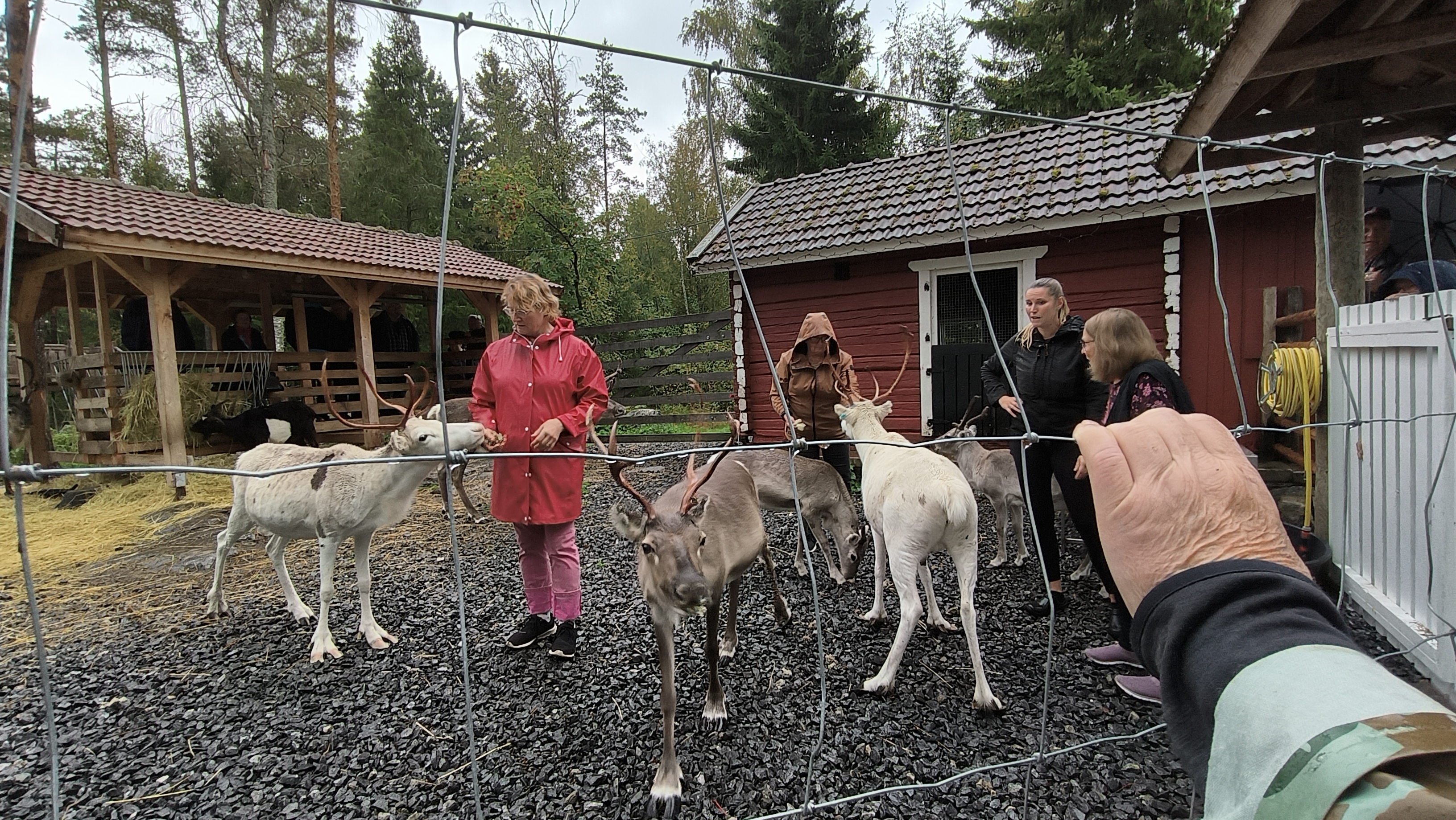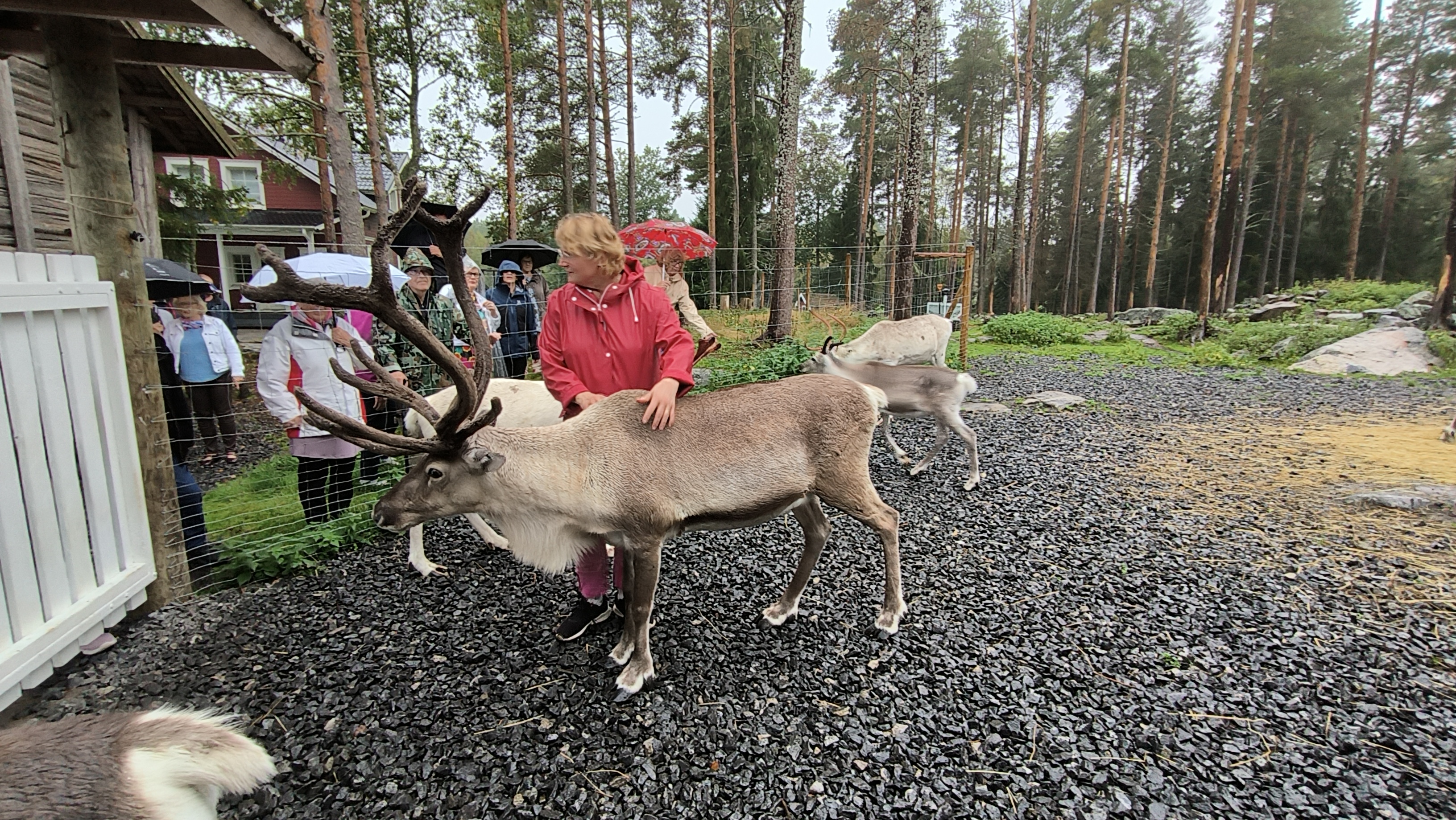Lounaan jälkeen sateisessa säässä matka jatkui Rödsöön Poro-Pirtille. Siellä meitä vastassa oli iloinen Sofia joka opastikin kuskimme ajamaan lähemmäksi eläinpihaa. Vähän tihkutti joten sateenvarjot esiin ja ensimmäiseksi käytiin tutustumassa upeaan Riihitupaan saunoineen kaikkineen. Sitten eläinpihalle jonne porot tulivatkin vieraita tervehtimään, Siinä niitä sitten oli vähän isompaa ja pienempää poroa kaikkineen 9. Oli Reino, Pasi, Risto, Ante, Kerttu..... Vuohiakin oli 3, yksi oli Uljas. Monenlaista tarinaa kuultiin porojen hoidosta, elämästä ja muutama meistä uskaltautui aitaukseen silittelemään poroja ja tarjoamaan jäkälää. Paljon oli kysyttävää ja osa jo hivuttautui sateisessa säässä linja-autolle. Auto veikin meidät sitten suurelle navetalle jonne on tehty juhla- ja kokoustiloja. Hyvin sovittiin suureen saliin joka oli valaistu kattoa myöten valonauhoilla, Poronsavia oli pöydissä koristeena ja ei muuta kuin taas kaffille. Kaffi maistuikin hyvältä porkkanaleivoksen kera. Vielä kuultiin monenlaista kerrontaa niin poronsarvista, poroerotuksista kuin monesta muustakin mm. juhlatilojen käytöstä.