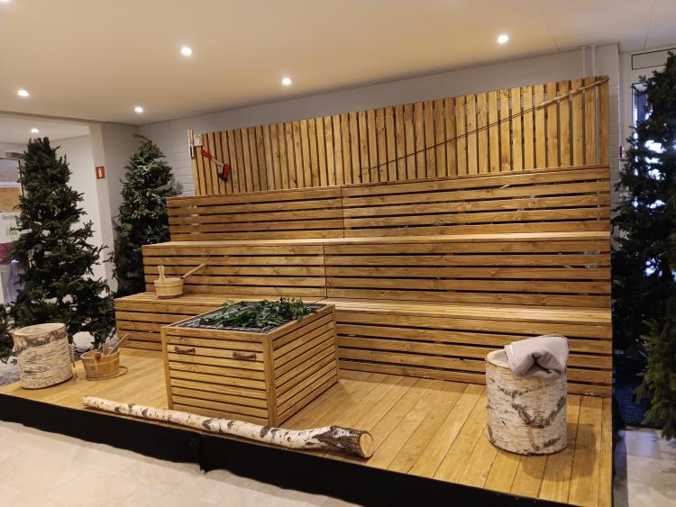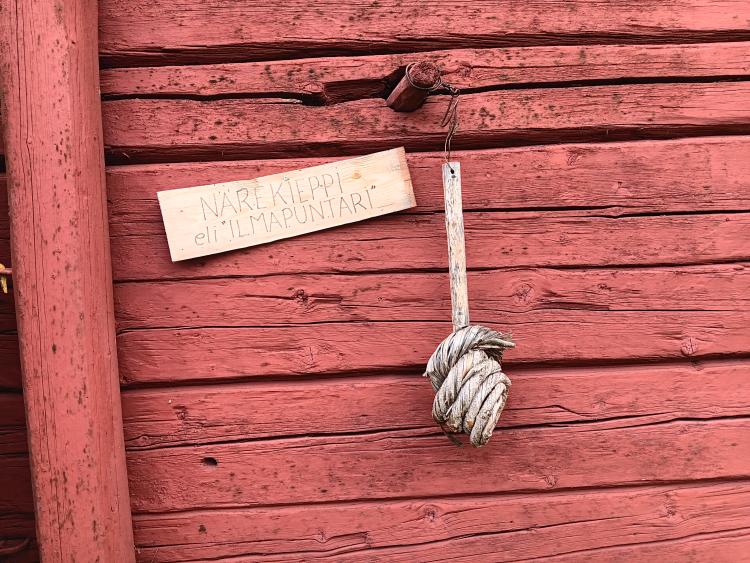 Sitten alkoikin jo ruoka olemaan mielessä, joten ajettiin Vöyrille. Norrvalla on nykyään suosittu kurssi- ja leirikeskus. Sen tilavassa ruokalassa oli hyvin tilaa koko ison ryhmän ruokailuun. Norrvallan aulassa on Kaj-yhtyeen saunarakennelma, joka oli heillä mukanaan kevään Euroviisuissa Sveitsissä. Moni siinä kuvauttikin muistoksi itsensä.