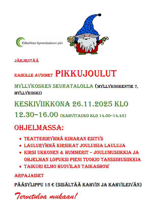 Piirin pikkujoulut Myllykoskella keskiviikkona 26.11.