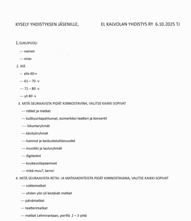 Dokumentin jälkeen meillä on tärkeä yhdistyksen toimintaan liittyvä asia: kyselemme jäsentemme mielipiteitä ja toiveita.