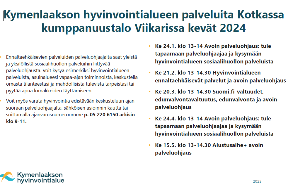 Kymenlaakson hyvinvointialue (HVA) pitää sarjan tilaisuuksia kumppanuustalo Viikarissa. Tilaisuudet ovat keskiviikkoisin 24.1, 21.2, 20.3, 24.4, 15.5. Tilaisuudet alkavat kello 13 ja kestävät tunnin tai puolitoista. Tilaisuuksissa on eri aiheista alustuksia mutta olennainen osa on henkilökohtaiset keskustelut. Jokainen voi kysyä HVA:n edustajilta itseään kiinnostavia asioita HVA:n palveluista.