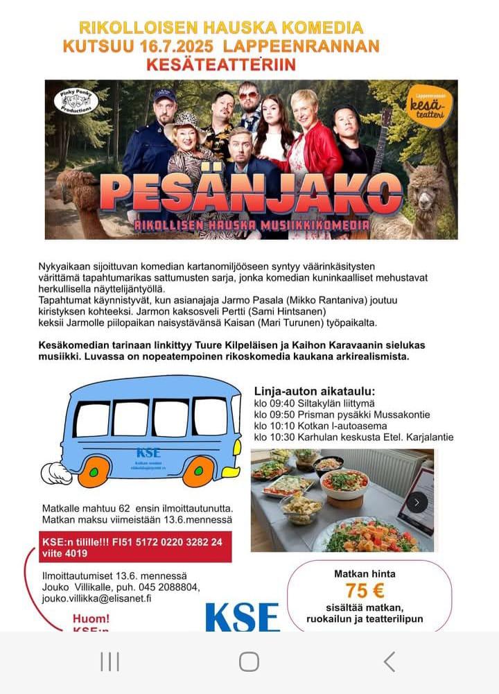 Hei,Yhdistyksen jäsenillä on mahdollisuus osallistua KSE:n järjestämälle iloiselle teatterimatkalle 16.07.2025 Lappeenrantaan.Tiedot oheisessa esitteessä.