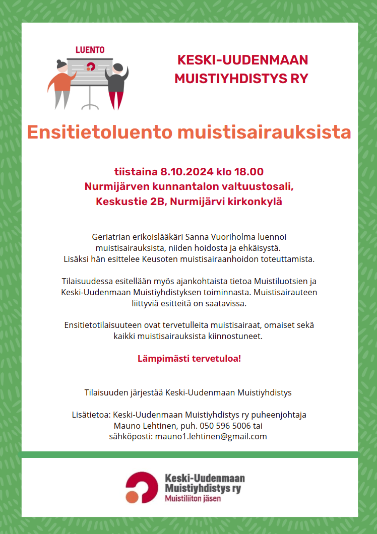 3. Ensitietoluento muistisairauksista ti 8.10.24 klo 18.00 Nurmijärven kunnantalossa