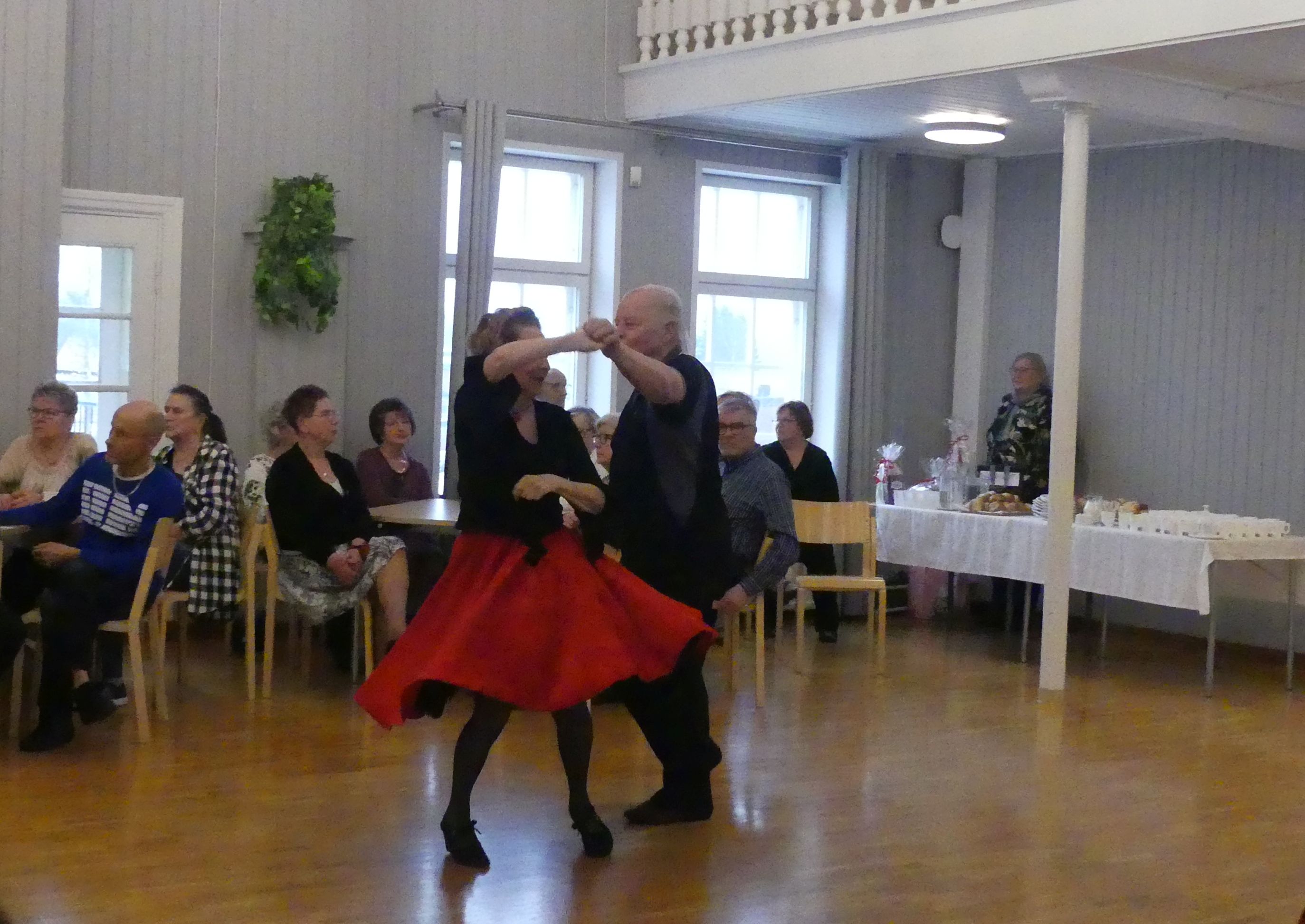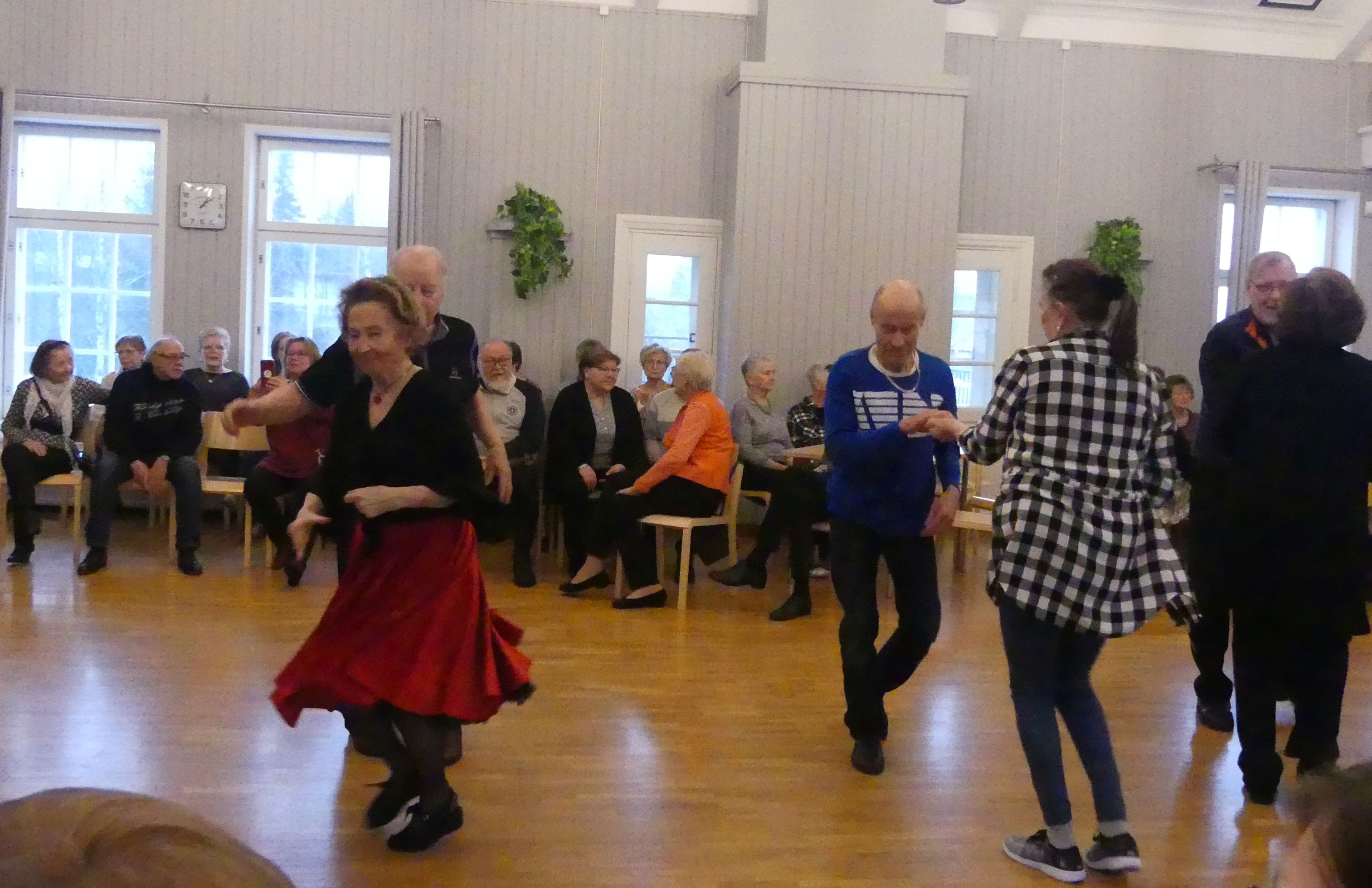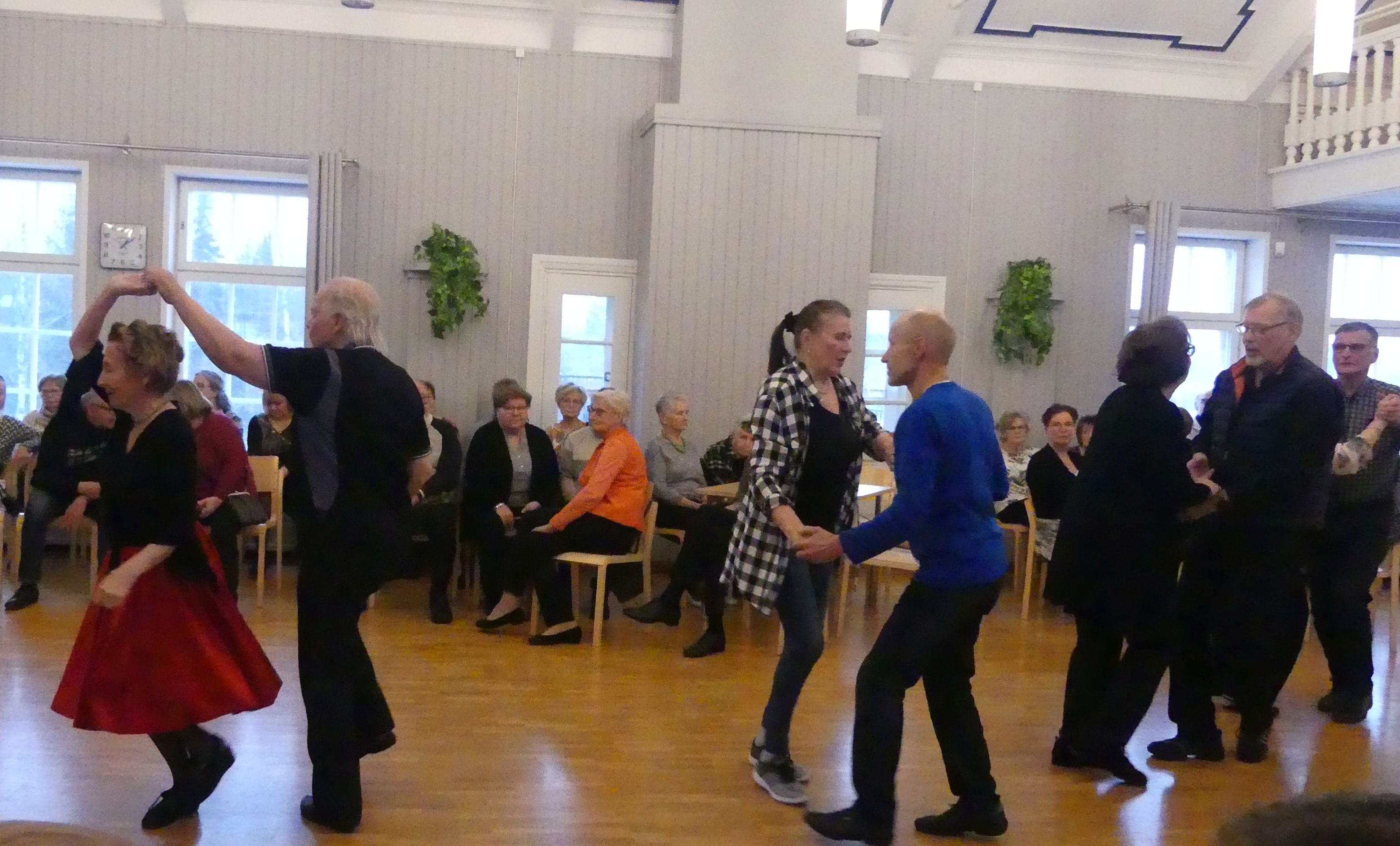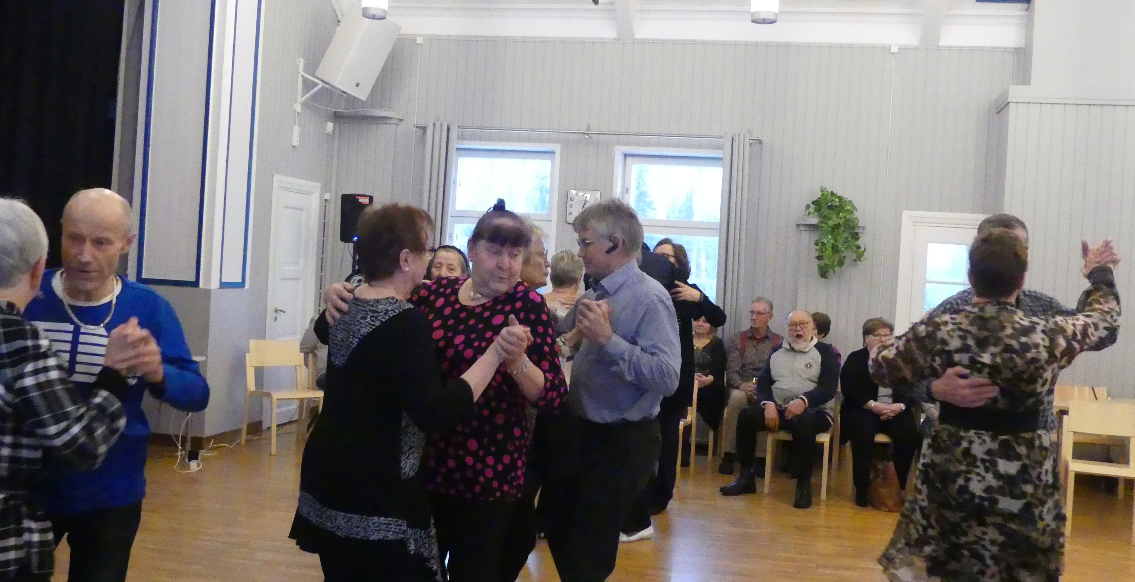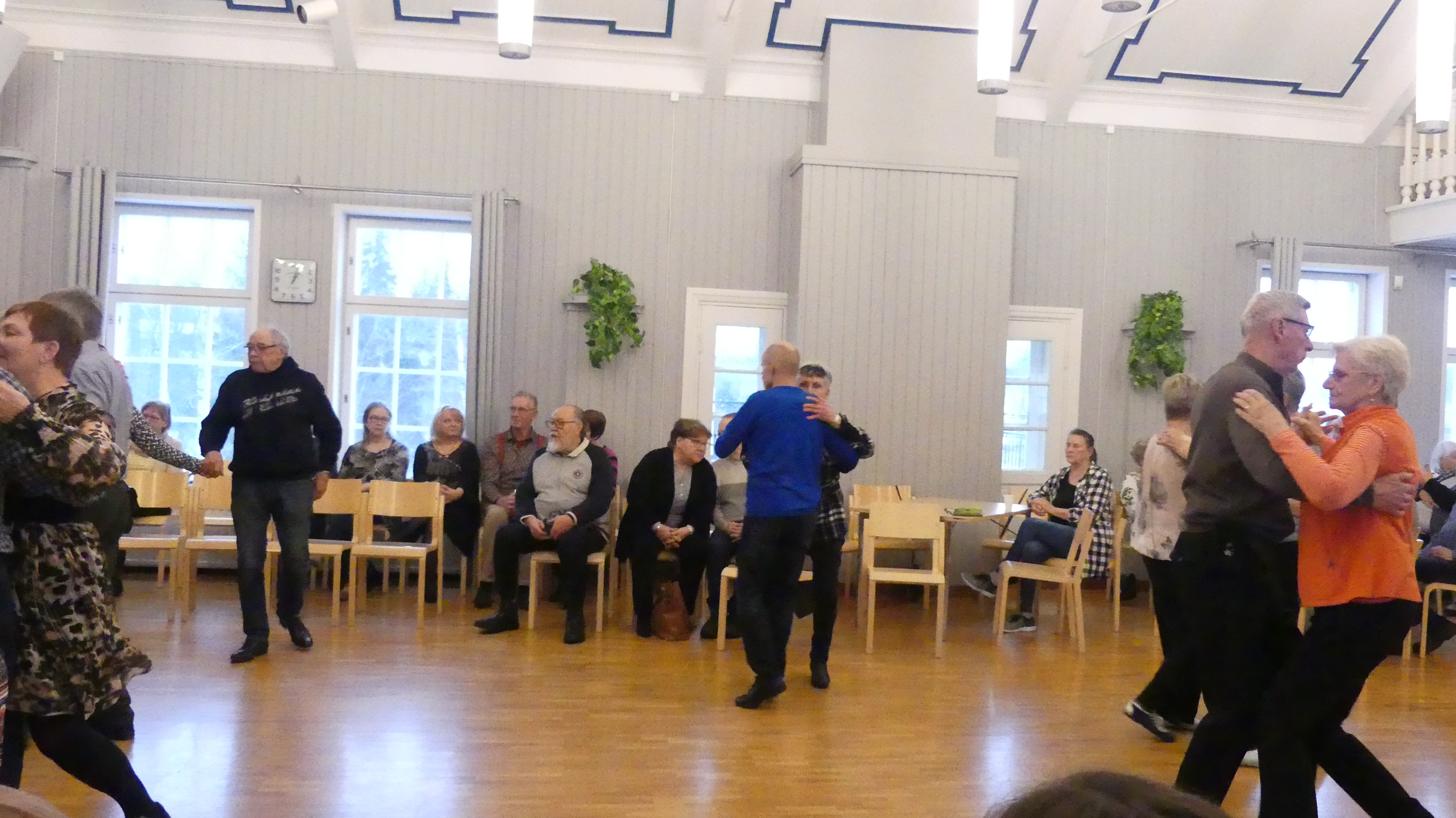 Väkeä paljon, iloisia kasvoja, puhetta ja naurua, tanssilattia täynnä. Naisethan ovat aina luontevasti tanssineet keskenäänkin kavaljeerin puuttuessa, ja niin nytkin. Yhdistyksen loistavat karaokelaulajat monipuolisine lauluineen takasivat viihtymisen, eikä ulkopuolista esiintyjää kukaan kaivannut. Hyvä ”massatapahtuma” kahveineen ja pullineen, seurusteluineen, oli siis samoja elementtejä kuin seurakuntakeskusten kuukausikerhoissa, mutta meno oli toisenlaista. Kiitos tilaisuuden järjestämisestä!