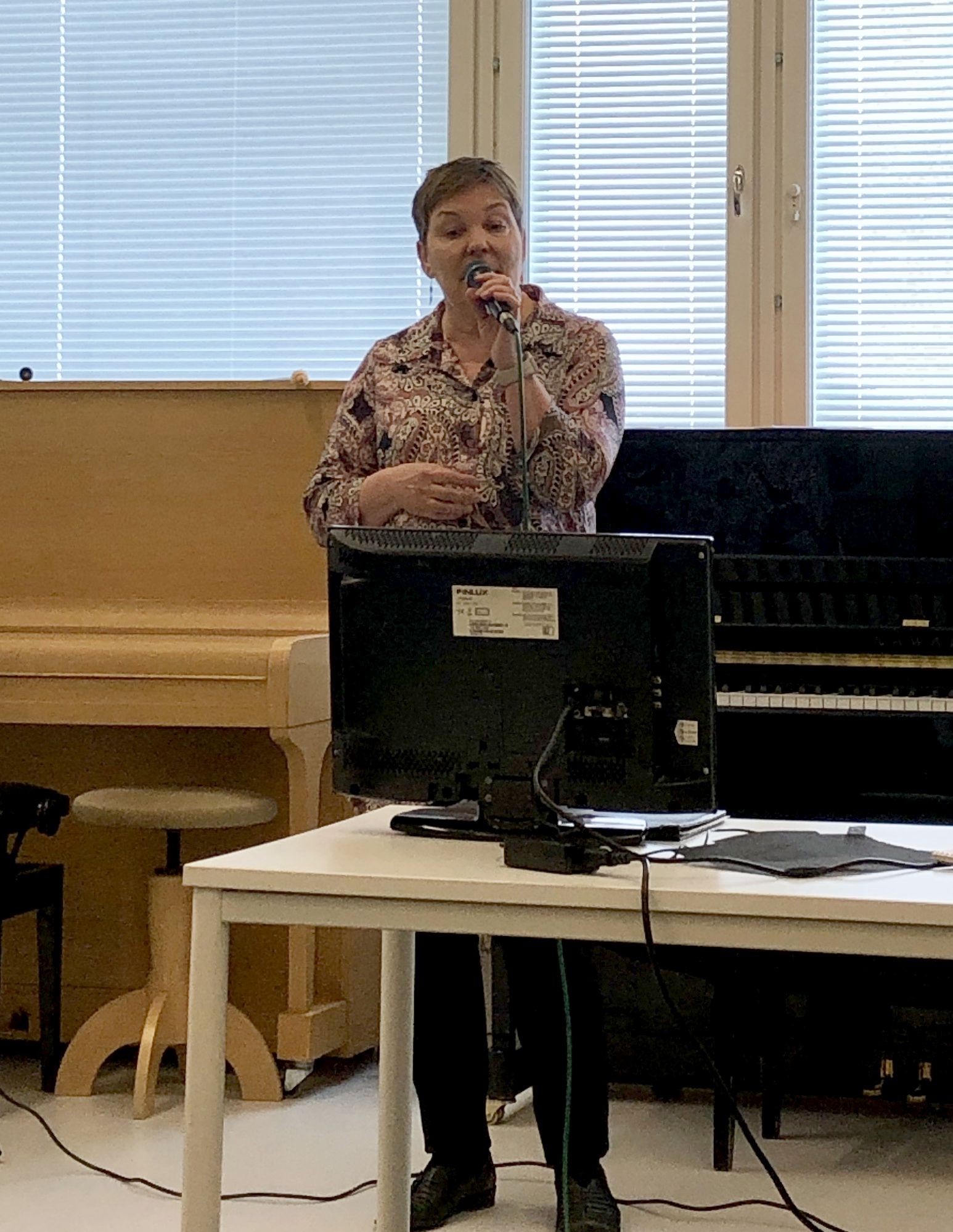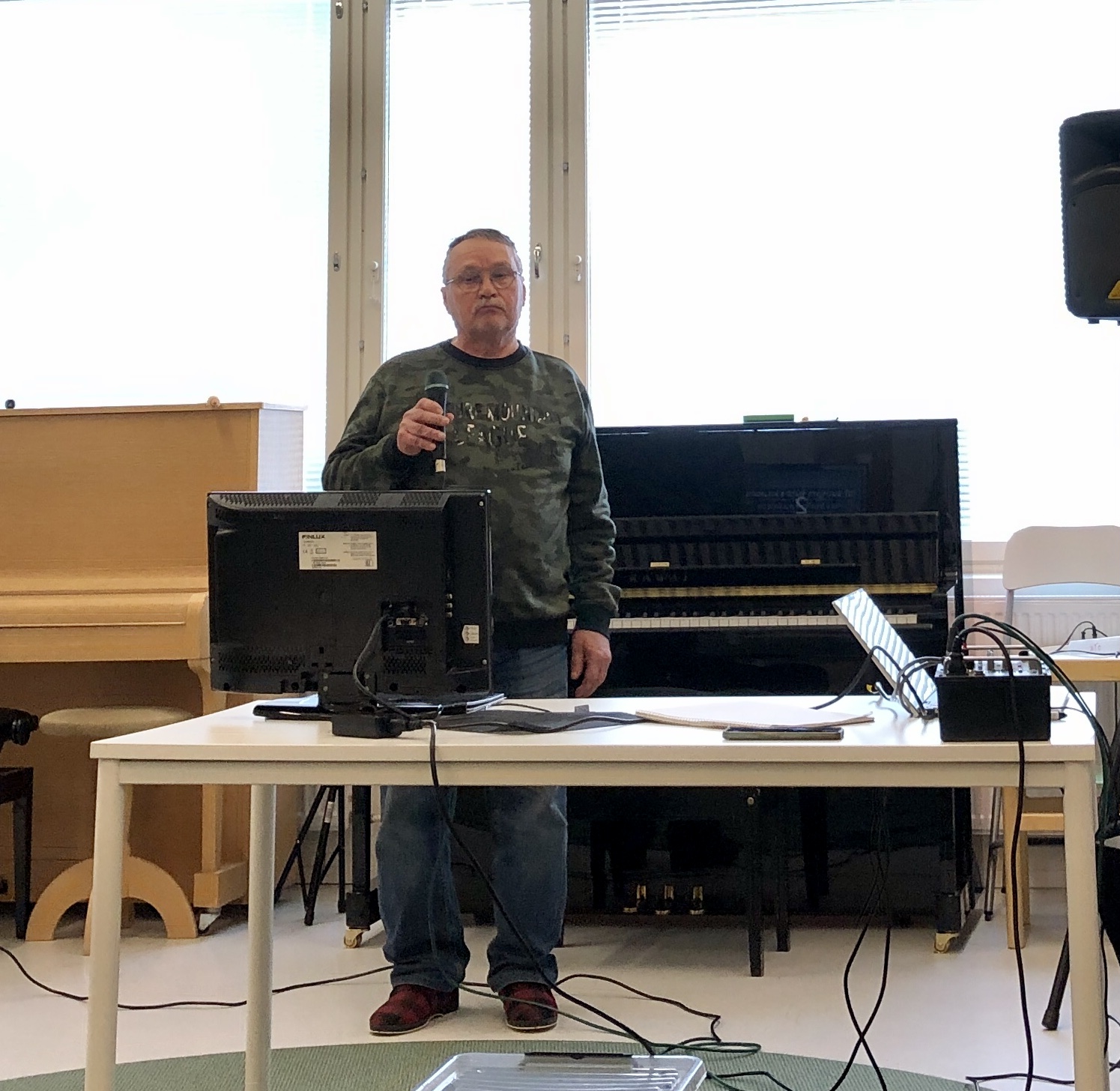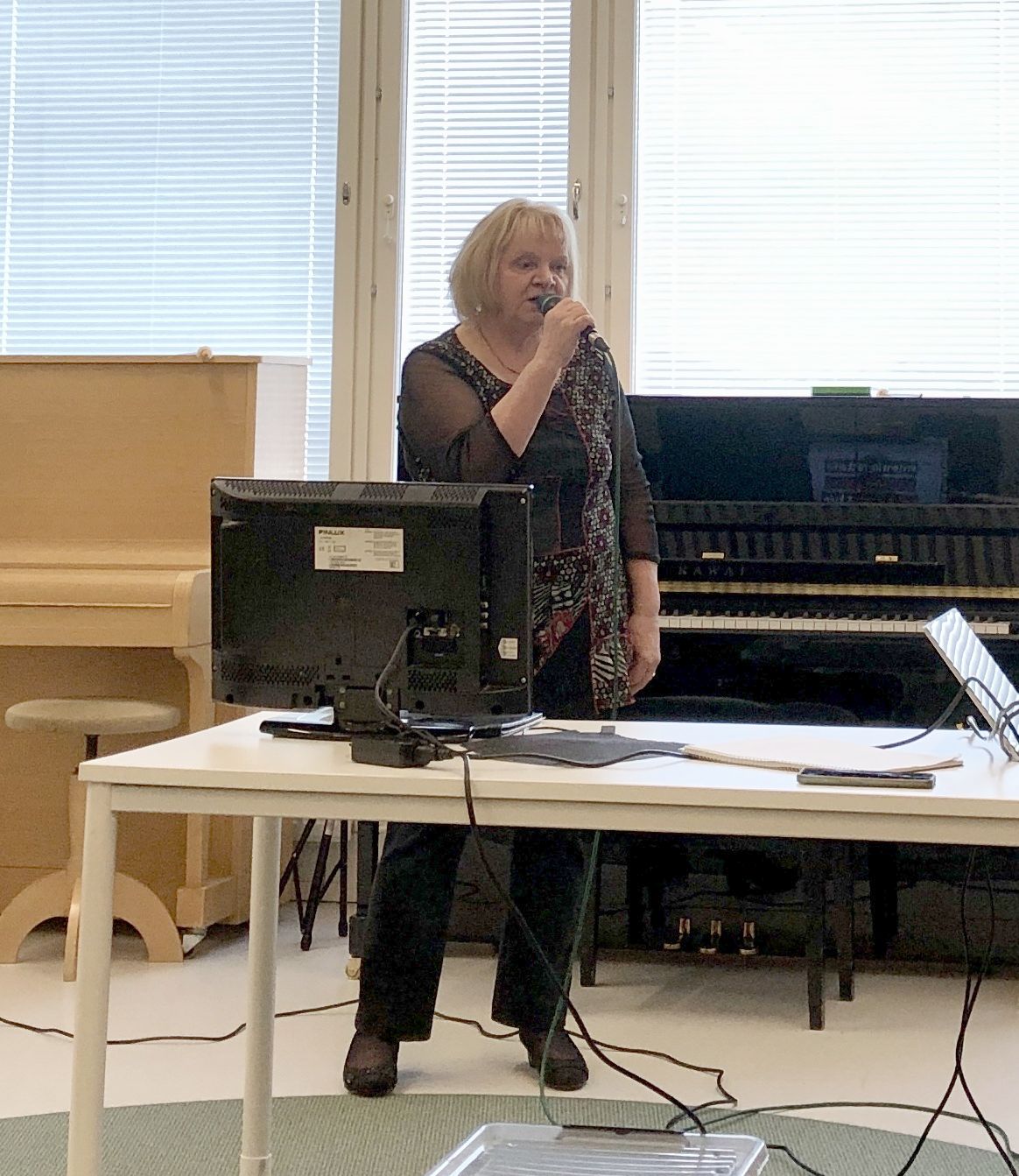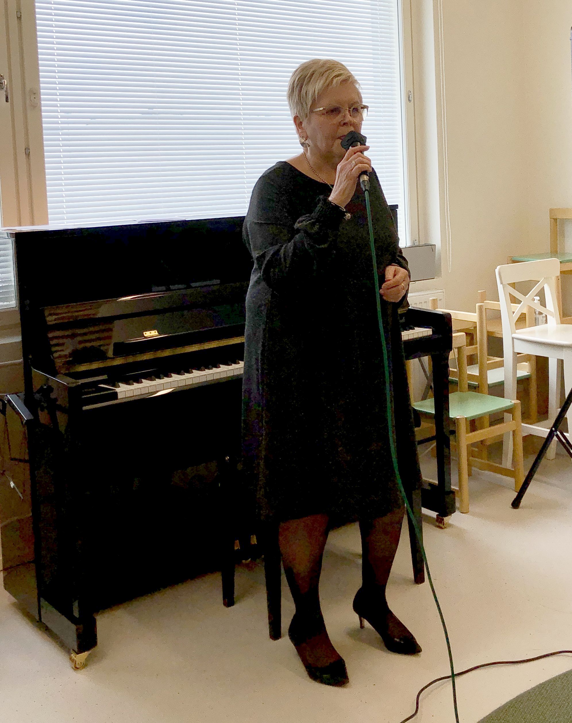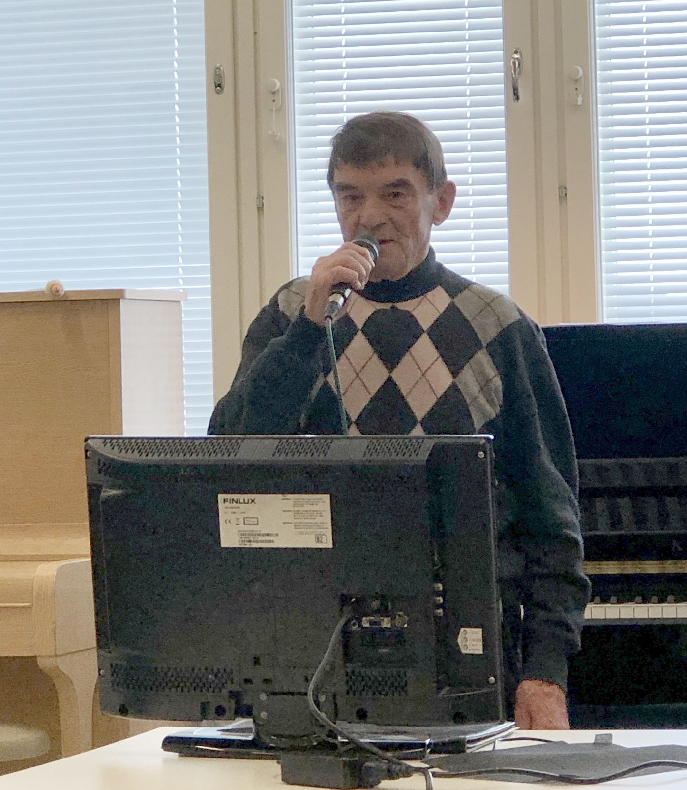 Klaukkalan Monikon Piccolo-sali täyttyi puolilta päivin keskiviikkona 29.3., kun yhdistyksen karaokekarsintoihin ilmoittautuneet laulajat asettuivat seinustoille sijoitettuihin tuoleihin, tuomarit ja sihteerit pöytänsä taakse ja kisoja isännöivä Jussi Stenberg laitteineen oman pöytänsä ääreen. Yleisöäkin oli kourallinen kannustamassa, joukossa yhdistyksen pj. Margit Taponen.