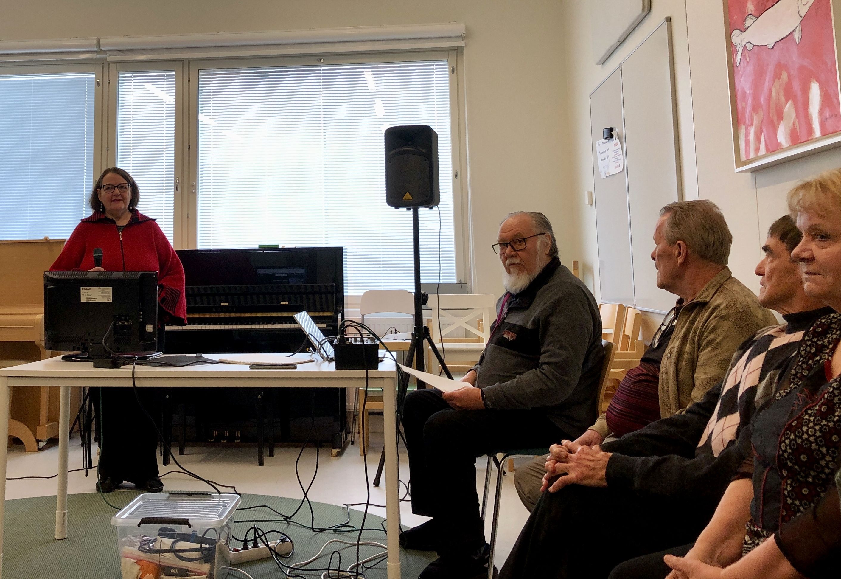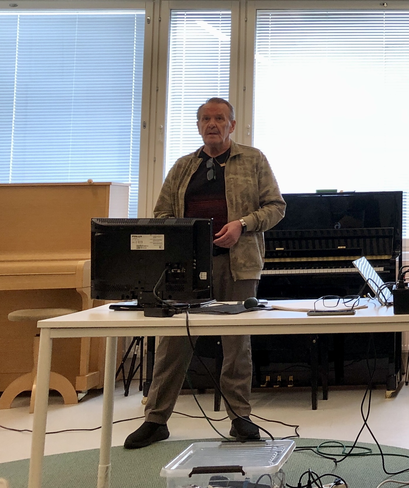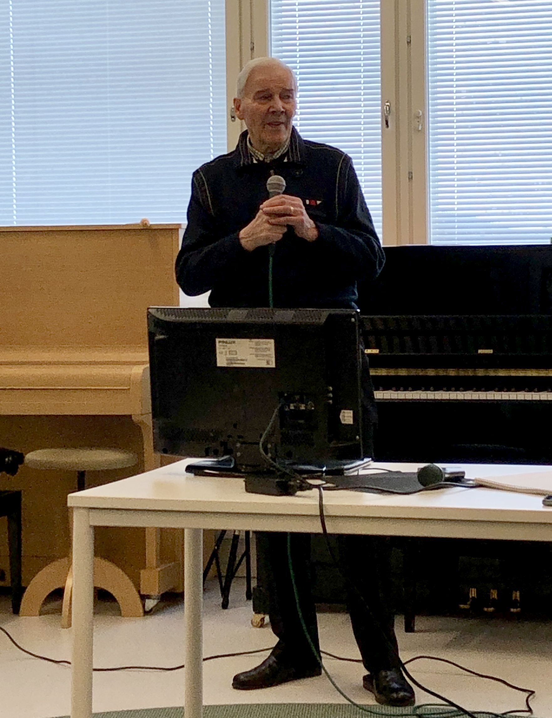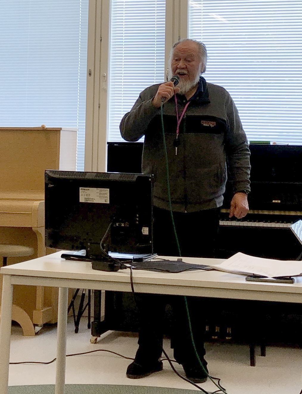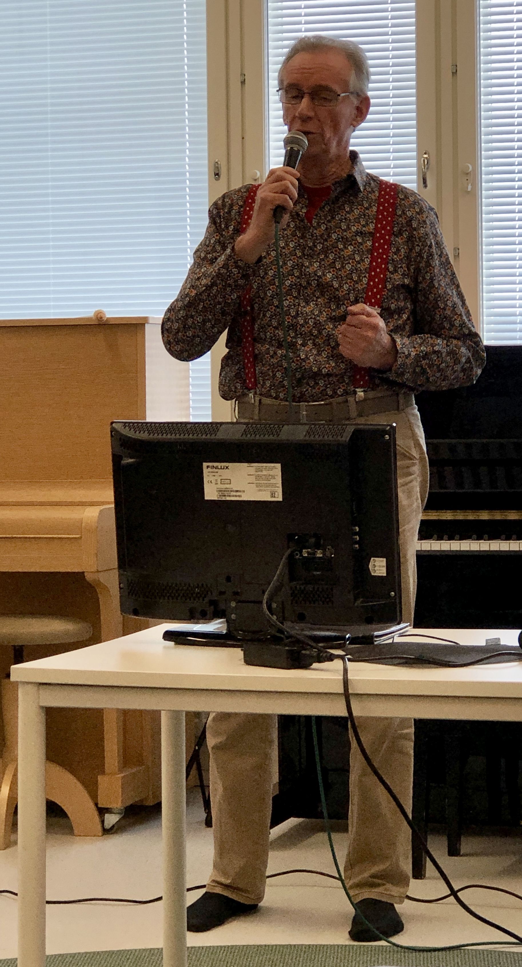 Klaukkalan Monikon Piccolo-sali täyttyi puolilta päivin keskiviikkona 29.3., kun yhdistyksen karaokekarsintoihin ilmoittautuneet laulajat asettuivat seinustoille sijoitettuihin tuoleihin, tuomarit ja sihteerit pöytänsä taakse ja kisoja isännöivä Jussi Stenberg laitteineen oman pöytänsä ääreen. Yleisöäkin oli kourallinen kannustamassa, joukossa yhdistyksen pj. Margit Taponen.