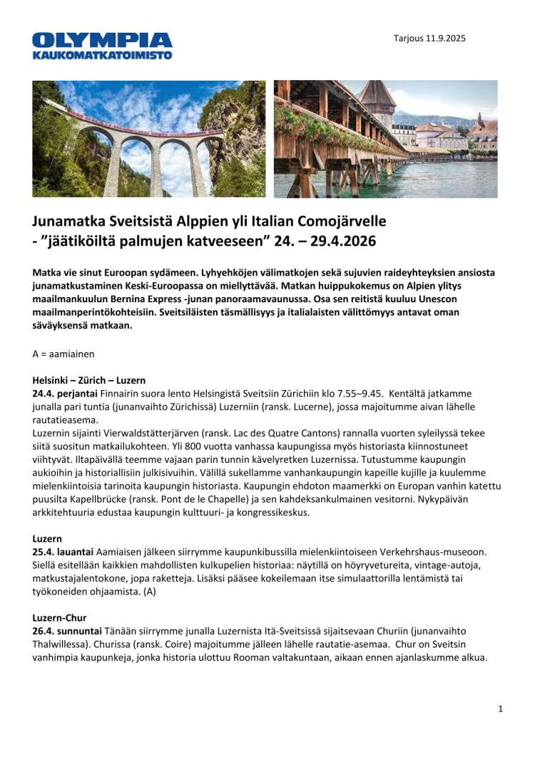 27.4. maanantai Matkamme yksi kohokohdista on tänään, kirjaimellisesti: nousemme Euroopan korkeimmalla (2235 m mpy.) liikennöivän Bernina Express -junan kyytiin, ja postikorttimaisen kaunis matkamme Churista Italian Tiranoon voi alkaa. 145 kilometrin junamatkamme kestää neljä tuntia. Osa reitistämme kuuluu Unescon maailmanperintökohteisiin. Matkalla on lähes 200 siltaa ja 55 tunnelia, joista pisin on melkein 6 kilometriä pitkä Albula. Junavaunumme panoraamaikkunoista voimme ihailla vaihtuvaa maisemaa ylittäessämme Alpit Sveitsistä Italiaan; junareittiä kutsutaankin ”jäätiköiltä palmujen katveeseen”. Jatkamme bussilla Comon kaupunkiin, jossa majoitumme kaupungin keskustahotelliin. (A)