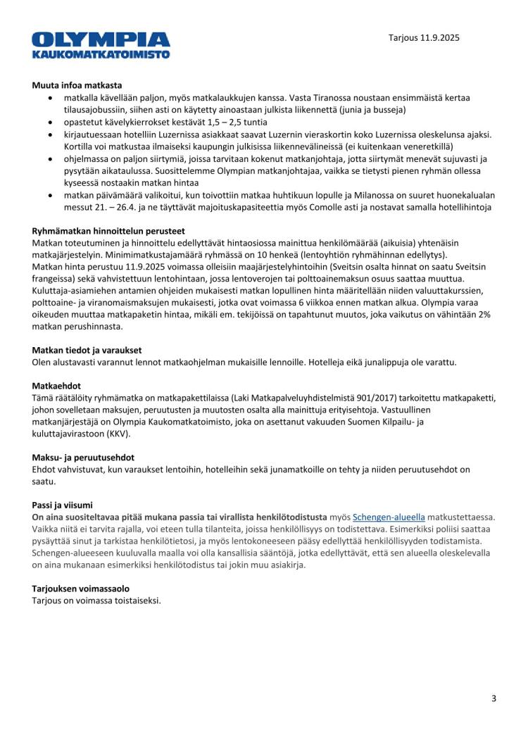 Matkan hinta perustuu 11.9.2025 voimassa olleisiin maajärjestelyhintoihin (Sveitsin osalta hinnat on saatu Sveitsin frangeissa) sekä vahvistettuun lentohintaan, jossa lentoverojen tai polttoainemaksun osuus saattaa muuttua.