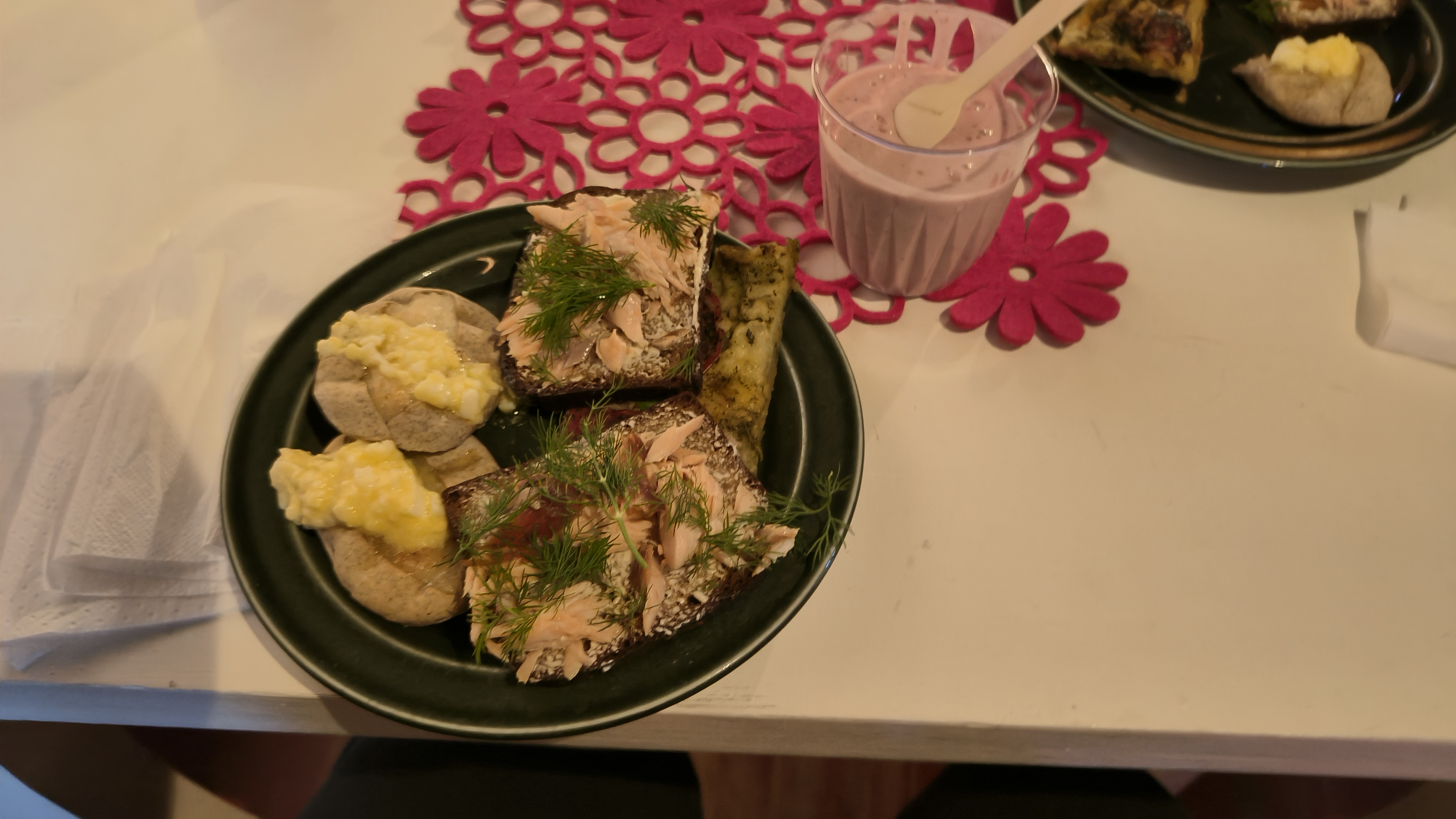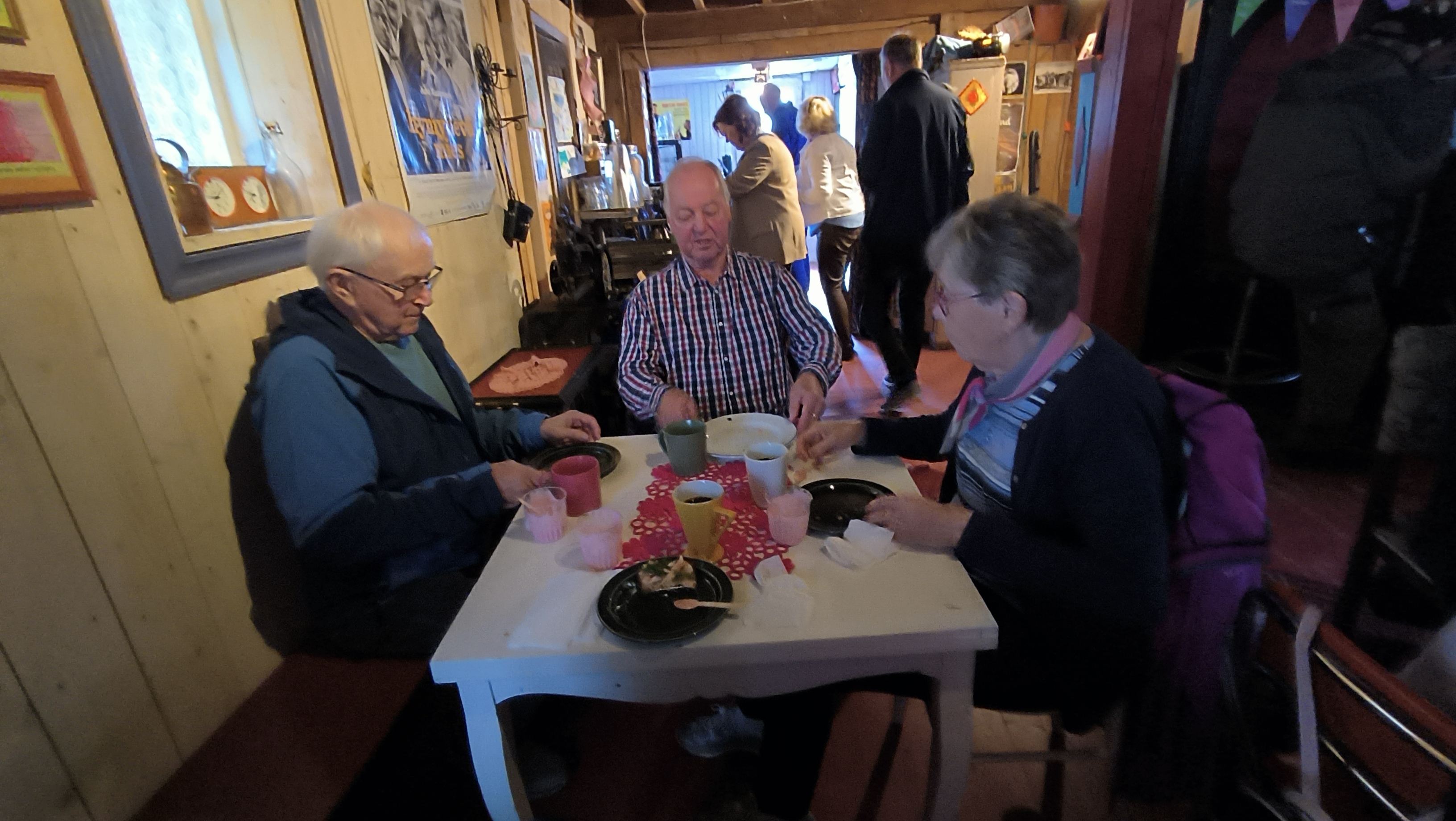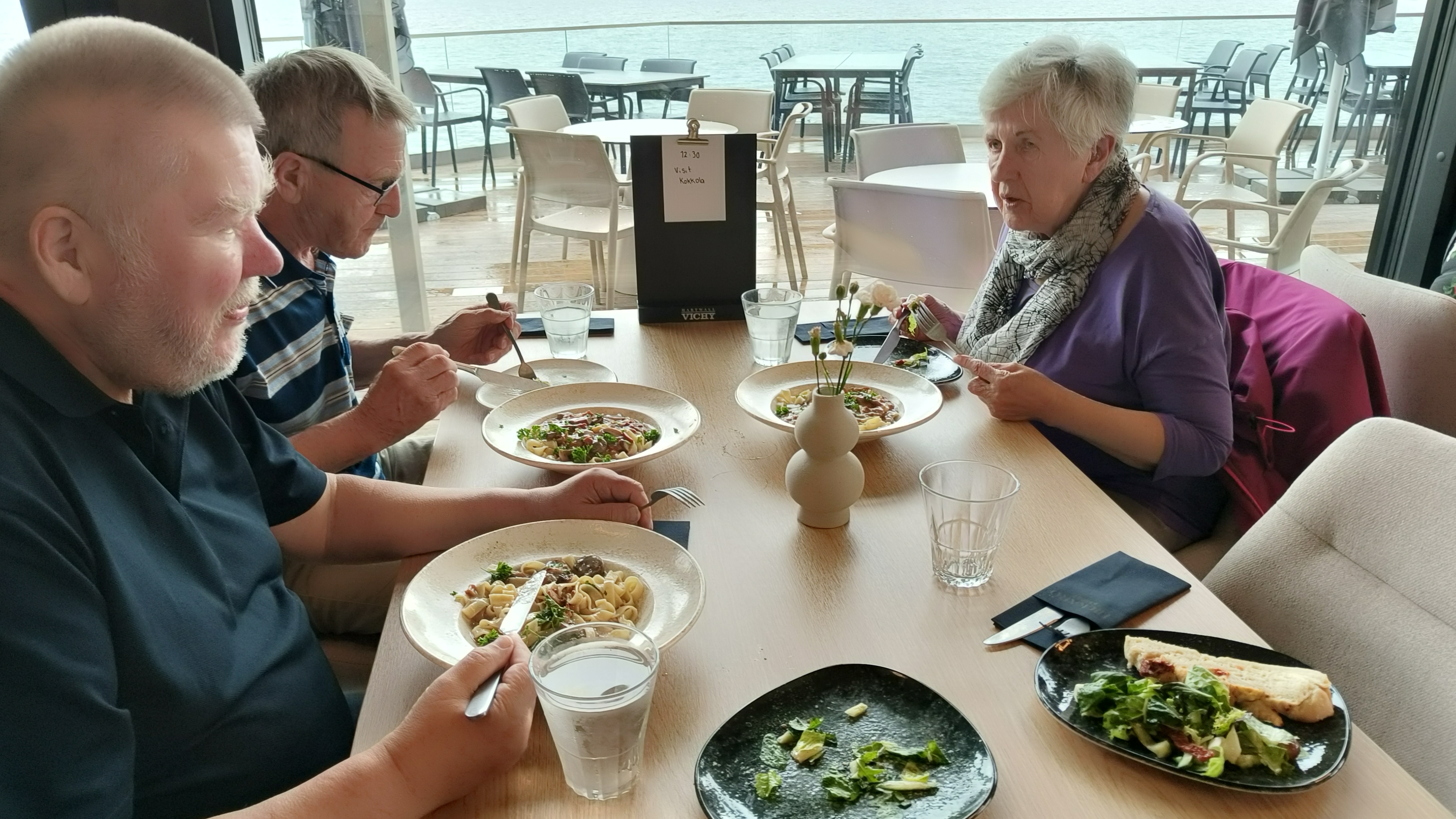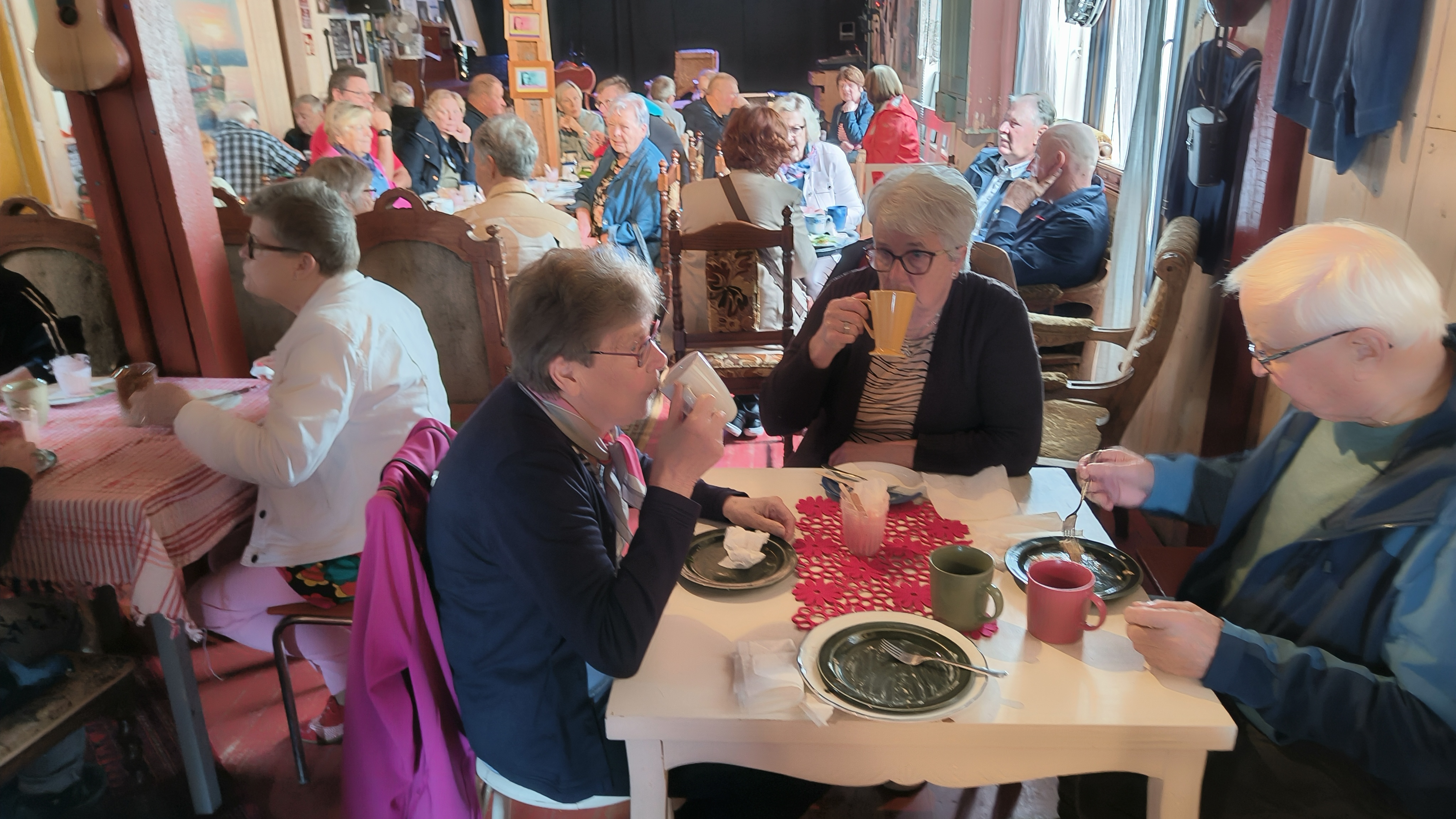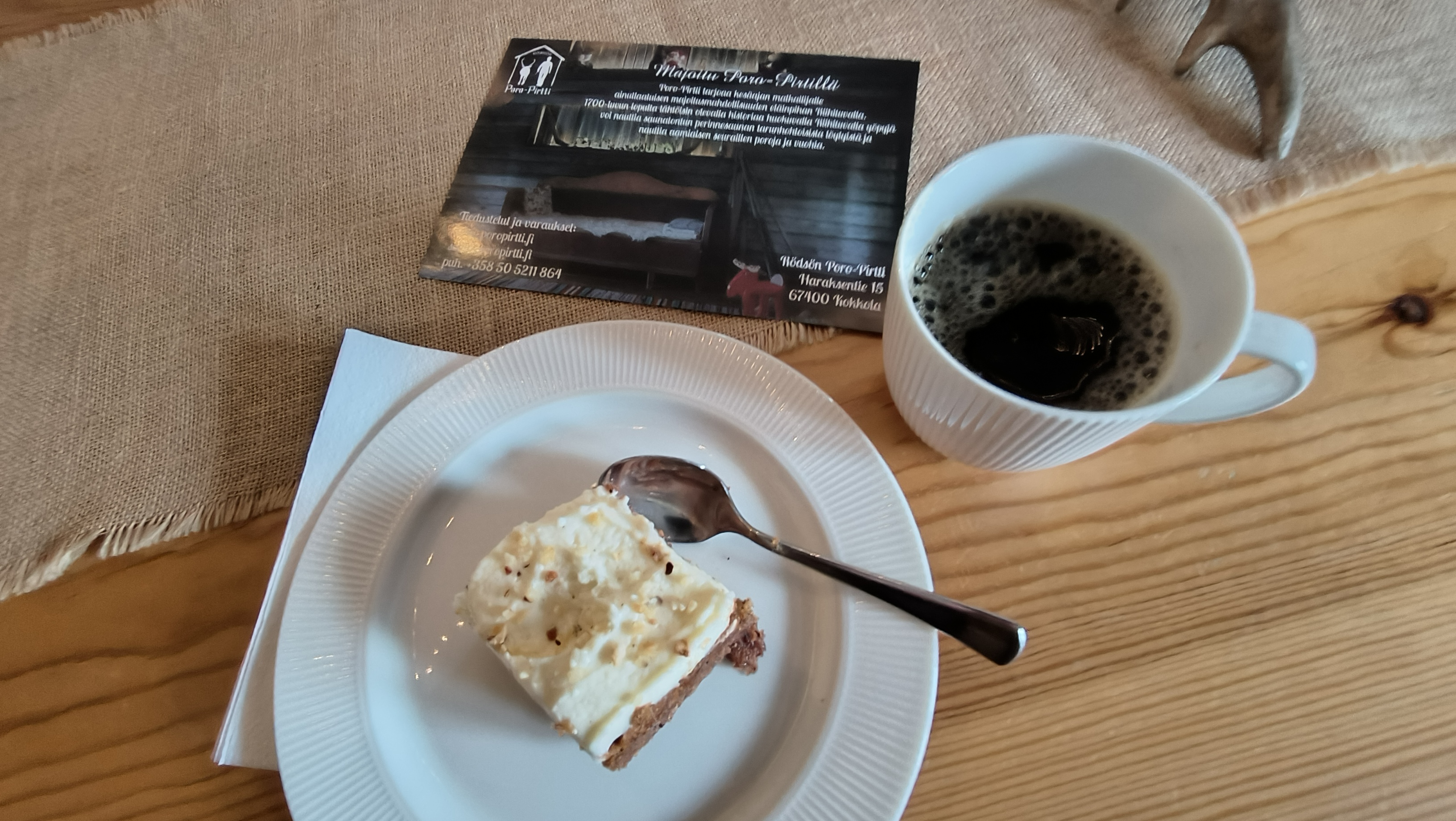 Sateisessa säässä matkattiin kohti Kokkolaa ja Ykspihlajaa. Ensimmäinen yllätyksellinen pysähdys oli Kahvila Saha Ykspihlajassa jossa meille oli luvassa Outi Airolan aamupala. Voi ihmettä minkälainen paikka sieltä löytyi ja todellinen aamupala: mm. karjalanpiirakat ja munavoi, saaristolaisleipää lohella, salamipiirakkaa. Lisäksi smoothit sekä kaffit omenapiirakan ja vanilijakastikkeen kera.