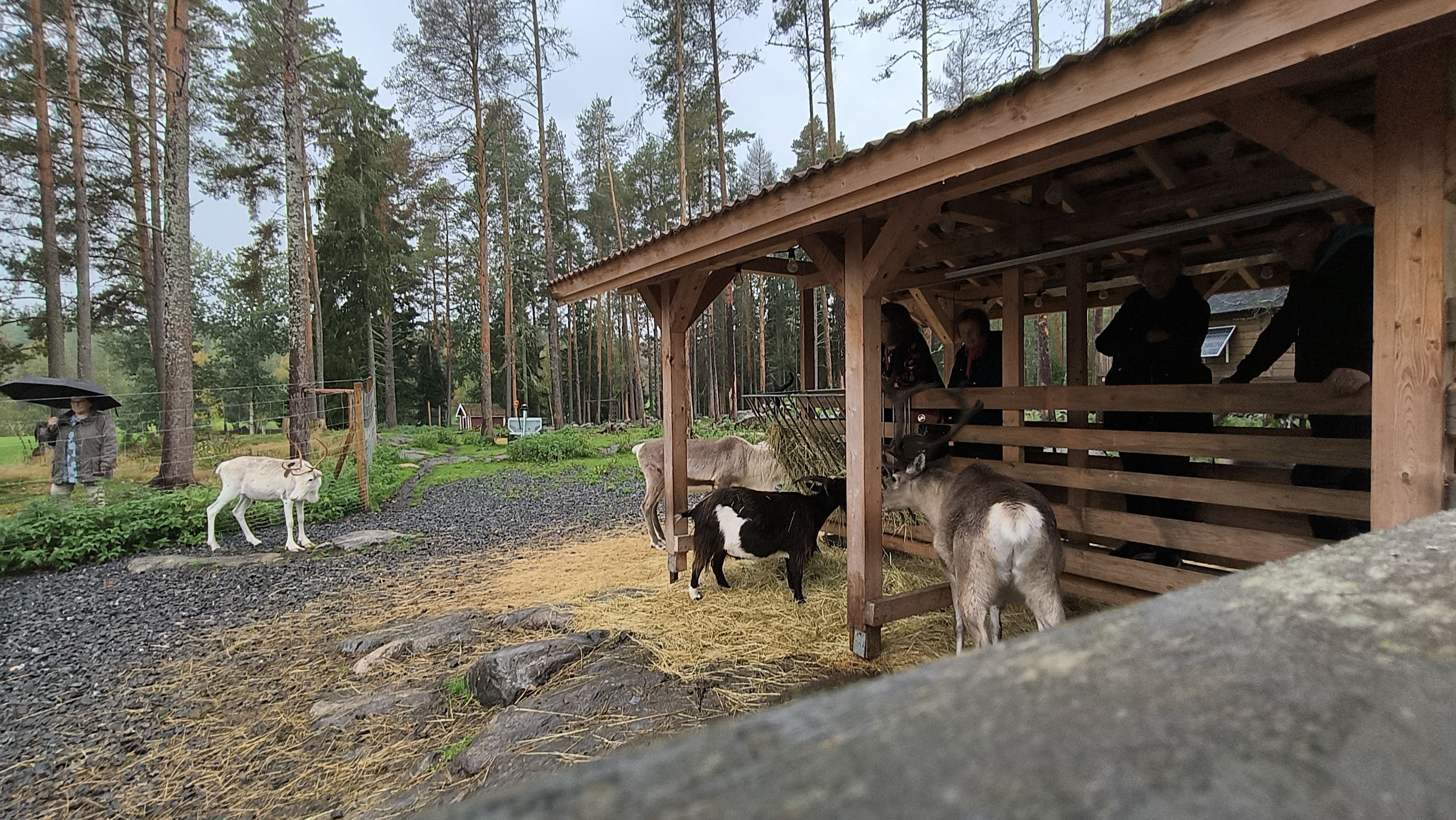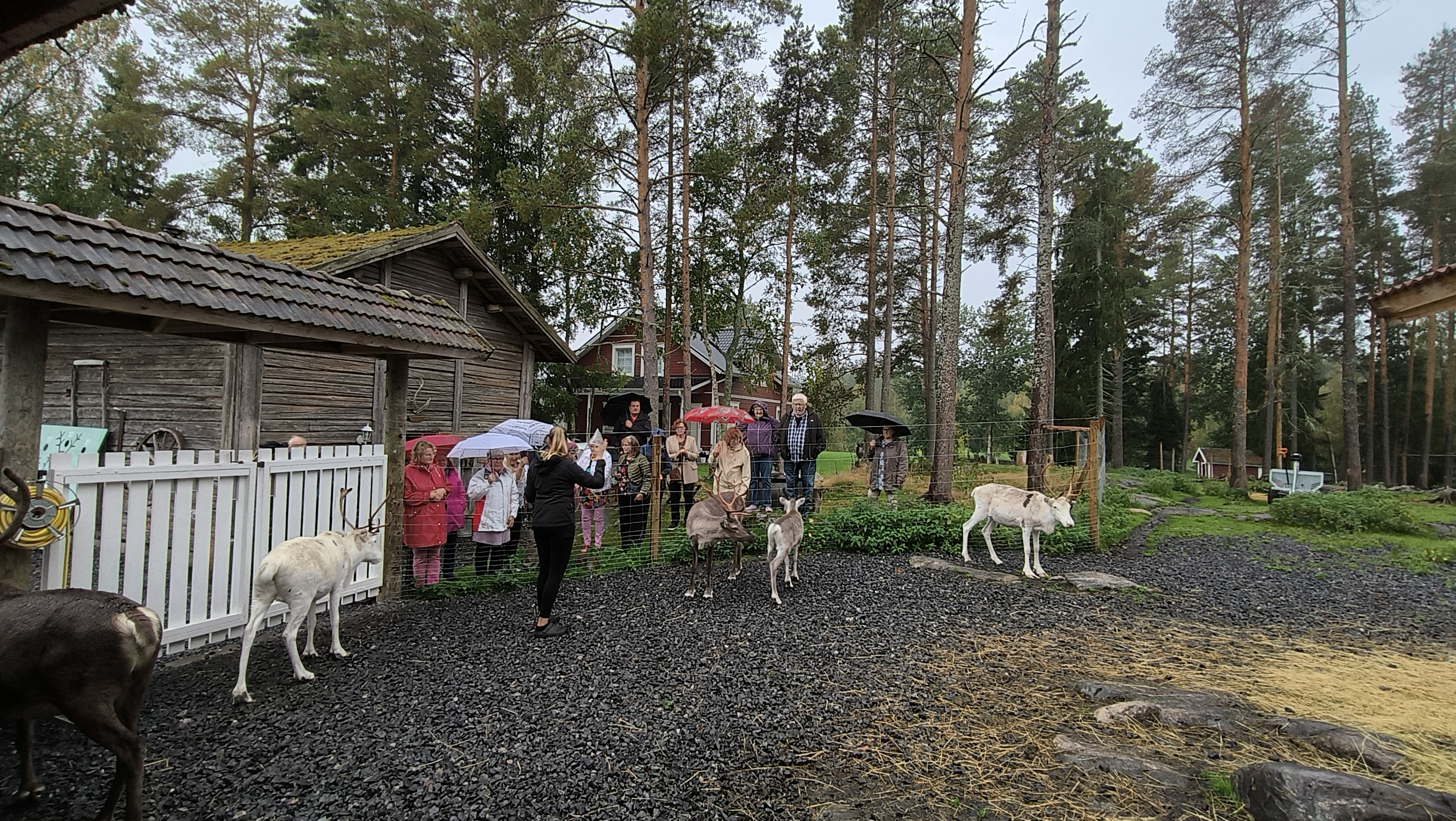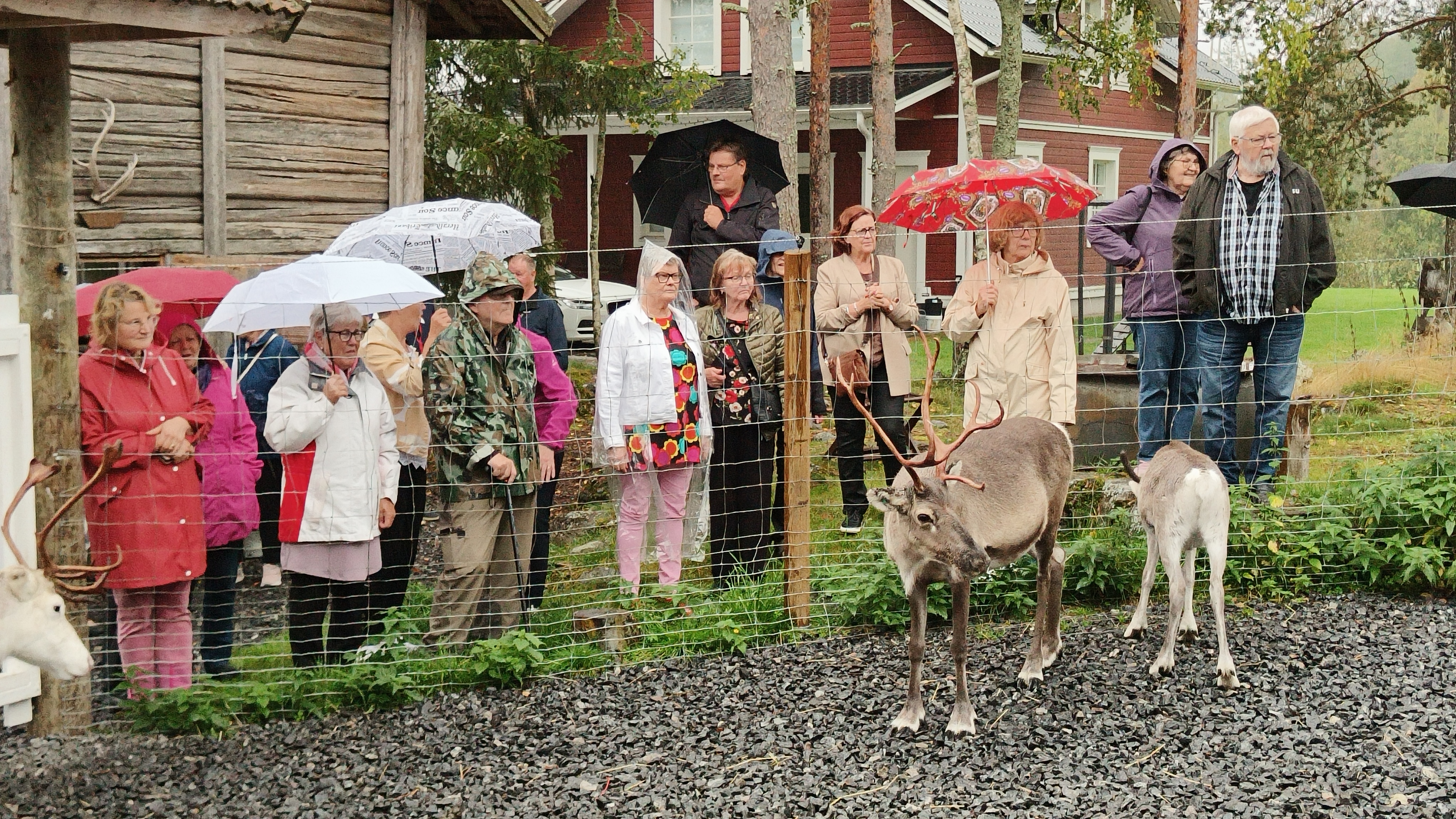 Lounaan jälkeen sateisessa säässä matka jatkui Rödsöön Poro-Pirtille. Siellä meitä vastassa oli iloinen Sofia joka opastikin kuskimme ajamaan lähemmäksi eläinpihaa. Vähän tihkutti joten sateenvarjot esiin ja ensimmäiseksi käytiin tutustumassa upeaan Riihitupaan saunoineen kaikkineen. Sitten eläinpihalle jonne porot tulivatkin vieraita tervehtimään, Siinä niitä sitten oli vähän isompaa ja pienempää poroa kaikkineen 9. Oli Reino, Pasi, Risto, Ante, Kerttu..... Vuohiakin oli 3, yksi oli Uljas. Monenlaista tarinaa kuultiin porojen hoidosta, elämästä ja muutama meistä uskaltautui aitaukseen silittelemään poroja ja tarjoamaan jäkälää. Paljon oli kysyttävää ja osa jo hivuttautui sateisessa säässä linja-autolle. Auto veikin meidät sitten suurelle navetalle jonne on tehty juhla- ja kokoustiloja. Hyvin sovittiin suureen saliin joka oli valaistu kattoa myöten valonauhoilla, Poronsavia oli pöydissä koristeena ja ei muuta kuin taas kaffille. Kaffi maistuikin hyvältä porkkanaleivoksen kera. Vielä kuultiin monenlaista kerrontaa niin poronsarvista, poroerotuksista kuin monesta muustakin mm. juhlatilojen käytöstä.