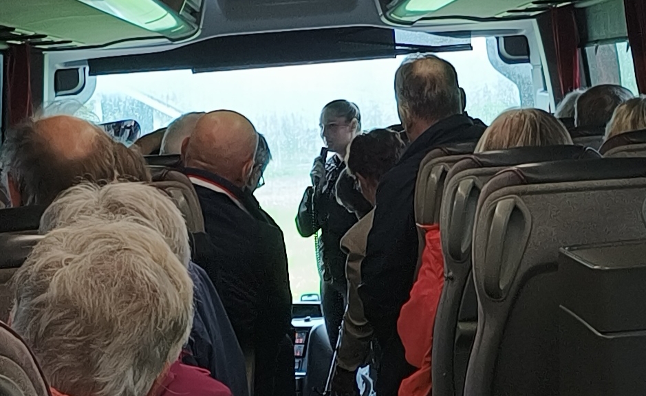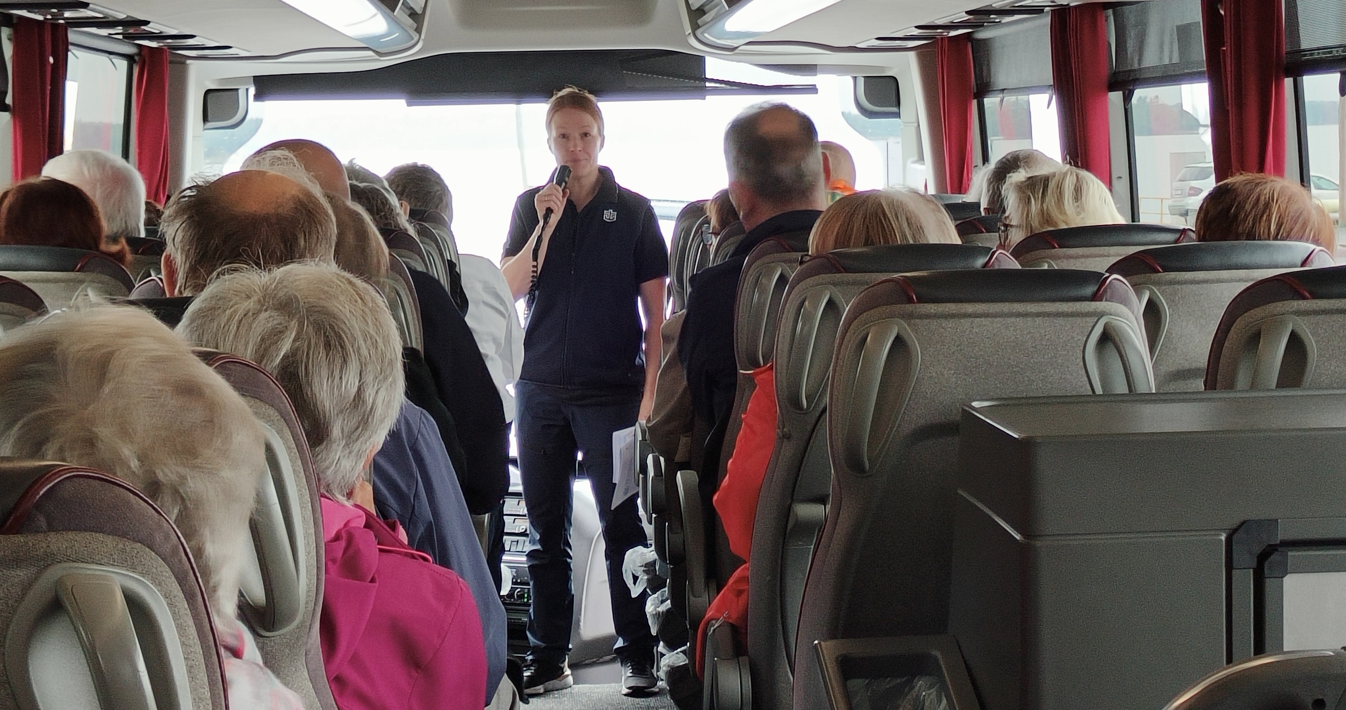 Lähes täysi bussilasti lähti kohti Kokkolaa, Sari toivotti kaikki tervetulleiksi ansaitulle matkalle ja kertoi päivän ohjelmasta: