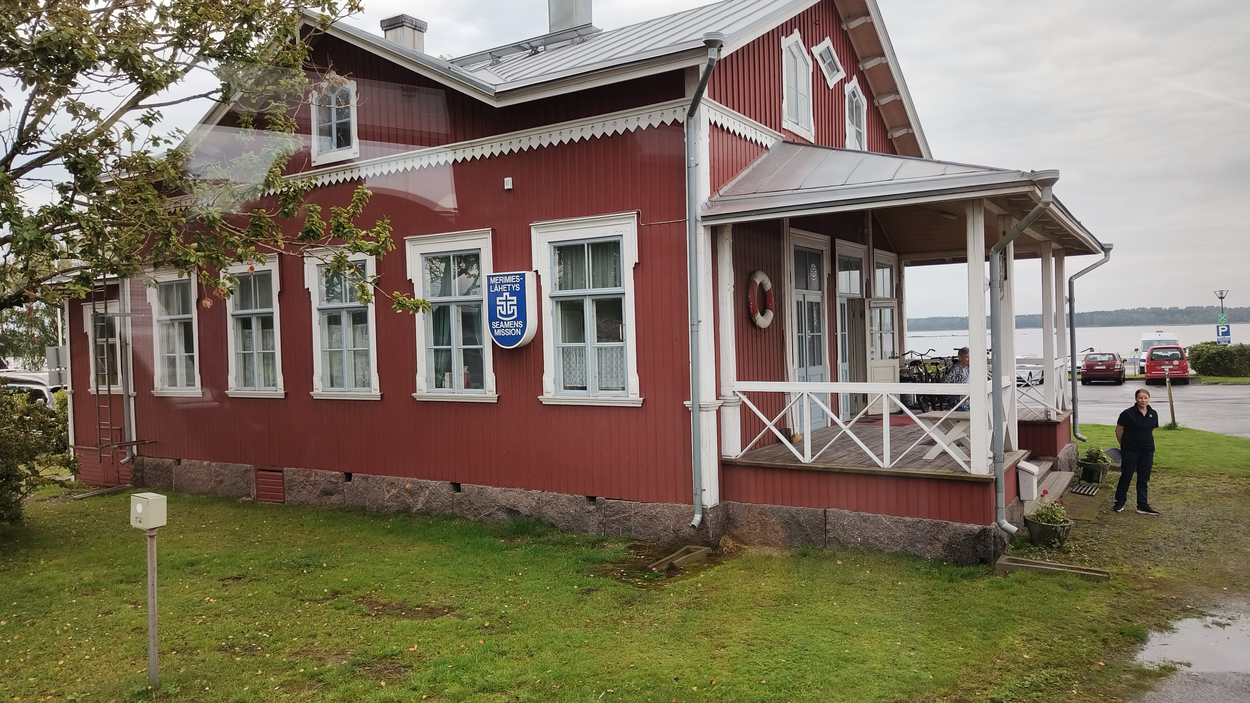 Teollisuusalueella pysähdyttiin Merimieskirkon eteen ja linja-autoon tuli satamakuraattori Jonna Kastell-Klapuri kertomaan mielenkiintoisia asioita mm. siitä kuinka hän palvelee merenkulkijoita laivavierailujen ja kuljetusten merkeissä. Monenlaisia kohtaamisia tulee mutta hänellä oli vankka kielitausta joten asioista selvitään.